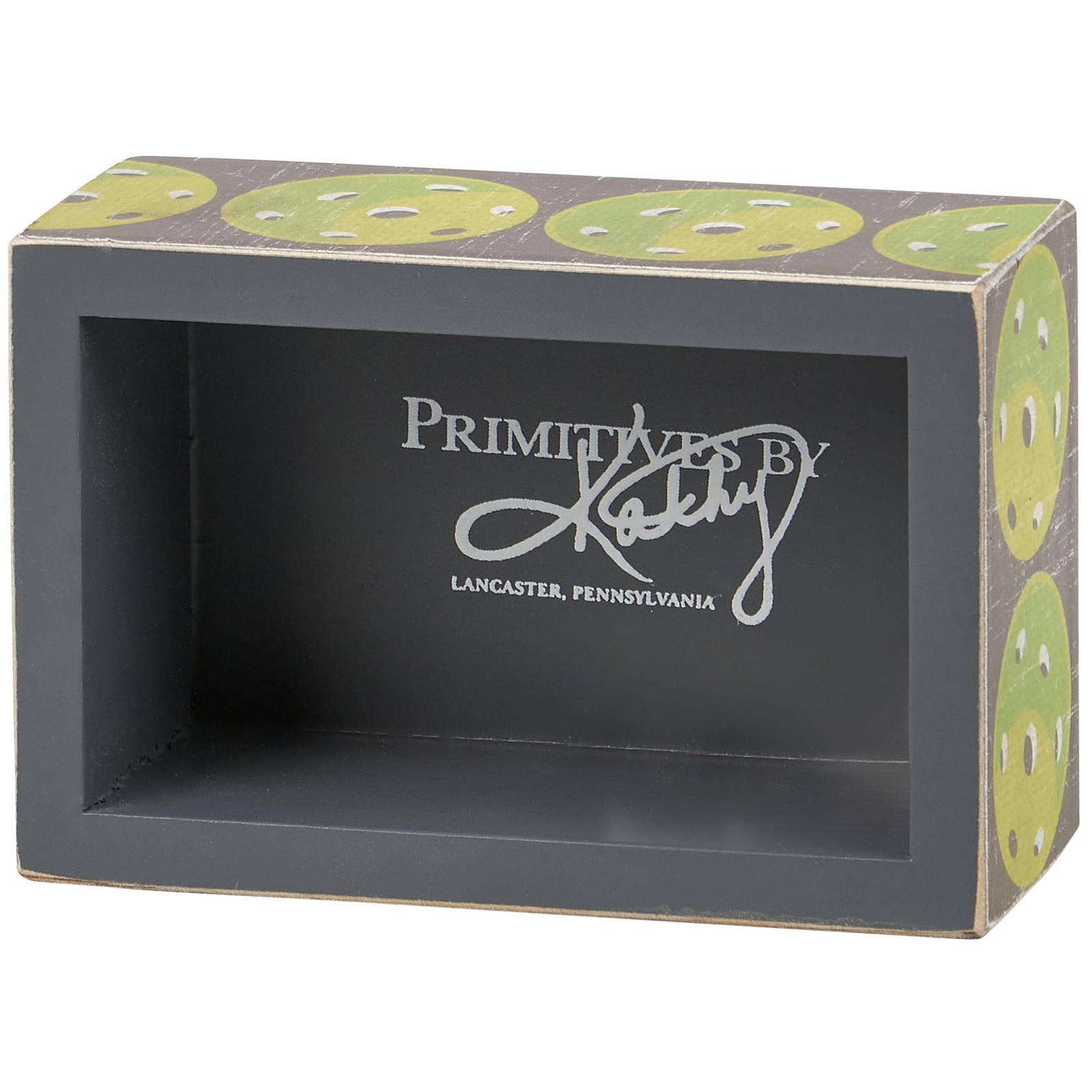 BOX SIGN STYLE: Features signature Primitives by Kathy wooden box sign style with coordinating pickleball pattern along the sides