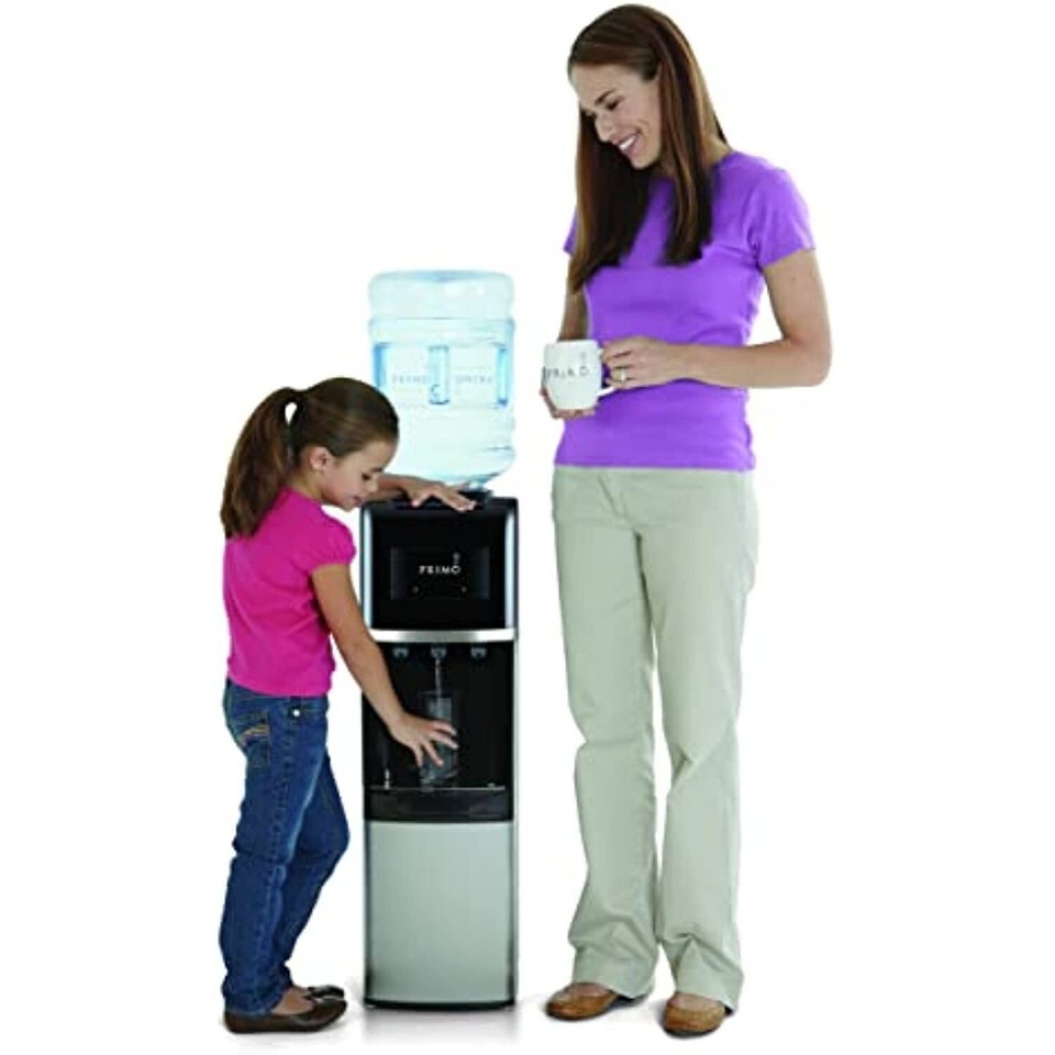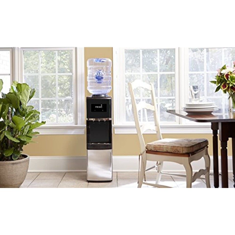 With the Primo Deluxe Water Dispenser with leak guard, ease is at your fingertips. Simply place the drip tray, install the included bracket to prevent tipping, load a 3- or 5-gallon bottle of Primo water and begin hydrating in no time with this 5-gallon water cooler. No plumbing is required. Stainless steel water reservoirs provide durability and the removable, stainless steel drip tray is dishwasher safe for easy cleaning. Whether you choose a 3- or 5-gallon bottle of Primo Purified Water with Minerals or you refill your own bottle at a Primo Self-Service Refill Station, our multi-step reverse osmosis process ensures you'll be drinking high-quality water. Primo Water is conveniently available at thousands of retail locations in the U.S. Start drinking more water with this 5-gallon hot, cold, and cool water dispenser today!