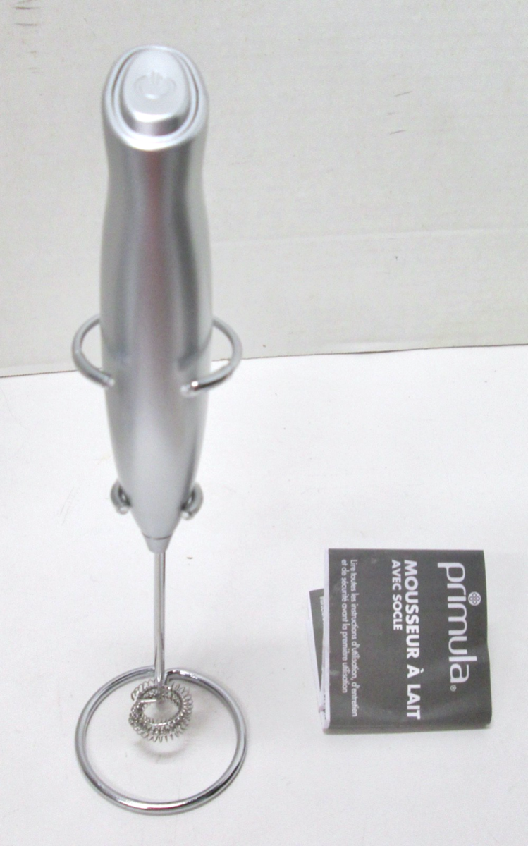New Open Box Primula Handheld Milk Frother W/Stand in Silver. The unit was never used. It has been tested and comes with batteries already installed. Sold with free shipping.