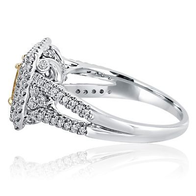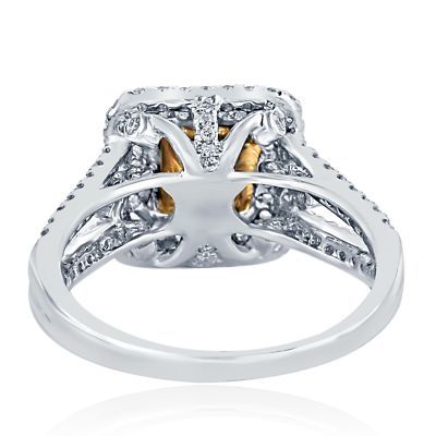 Cette superbe bague de fiancailles a tige divisee comprend un diamant jaune leger de 0,89 carat princesse entoure d'un double halo chatoyant de diamants rond incolores qui donnent l'illusion d'un diamant central plus grand. Fabrique a la main en or multi-tons de 14 carats. Le poids total des carats est de 1,51 carats.