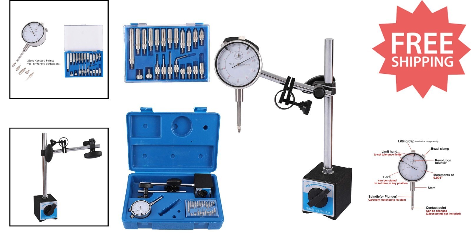 - Professional 0-1" Dial Indicator with Adjustable Magnetic Base & 22 Tips