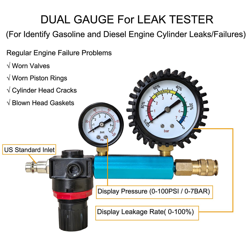 Identify Engine Issues with Confidence. The dual-gauge leak detector helps pinpoint common engine failures?including cracked cylinder heads, faulty piston rings, leaking valves, and blown gaskets?by displaying pressure drop and leakage percentage visually and accurately.