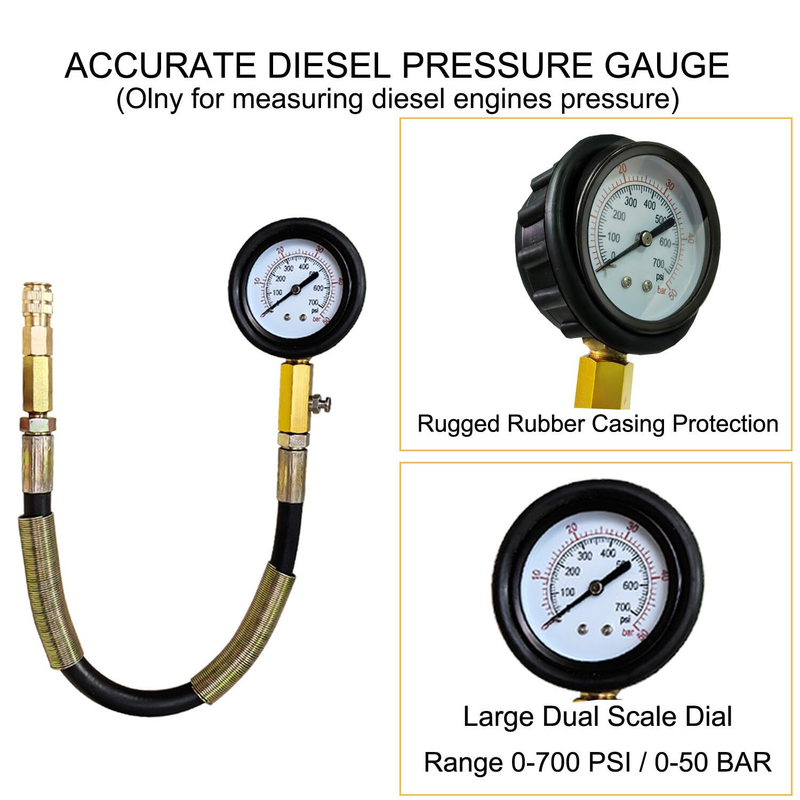 High-Accuracy Dual Gauge with Safety Features. Features a precision dual-scale gauge (PSI and BAR) with a rubber-protected face and built-in pressure release valve for safe depressurization. Accurately measures compression up to 50 BAR / 725 PSI, reducing injection risks and improving user safety.