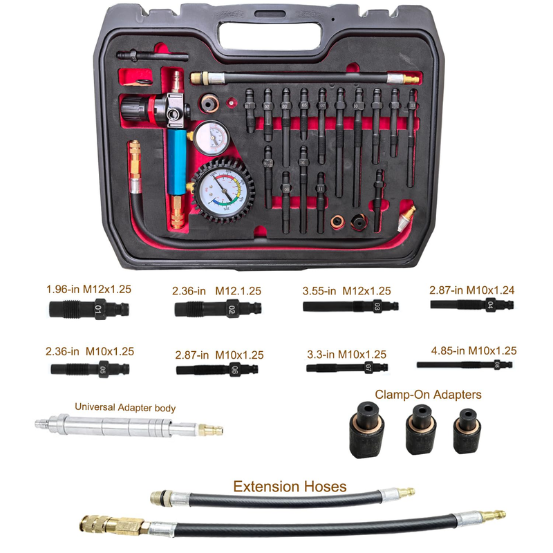 All-in-One Compression Leakage Diagnostic Solution. This professional-grade 46-piece kit combines a diesel compression tester and a dual-gauge leak down tester in one versatile set. Equipped with glow plug, injector, and spark plug adapters, it delivers accurate compression readings and leakage rate measurements for both petrol and diesel engines?ideal for comprehensive engine diagnostics.