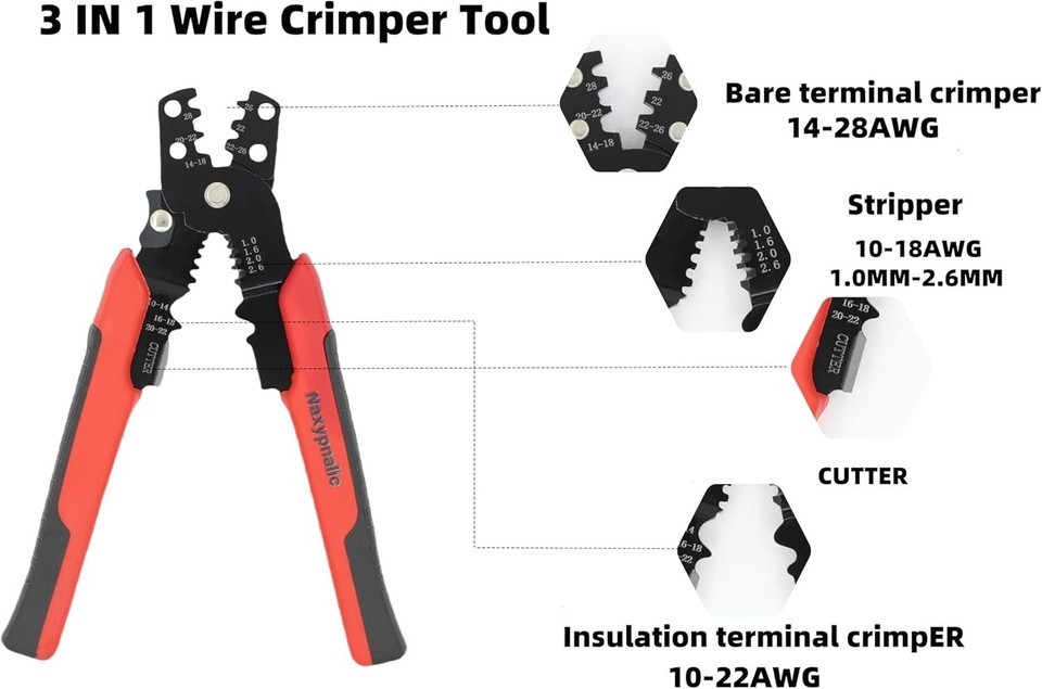 Professional Tool Solution 3-in-1 Wire Crimping Tool 26-10 AWG, Wire Stripper/Cutter for Insulated, Bare Heat-Shrink Connectors, Ergonomic Red Handle