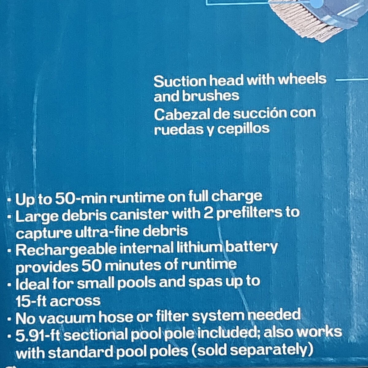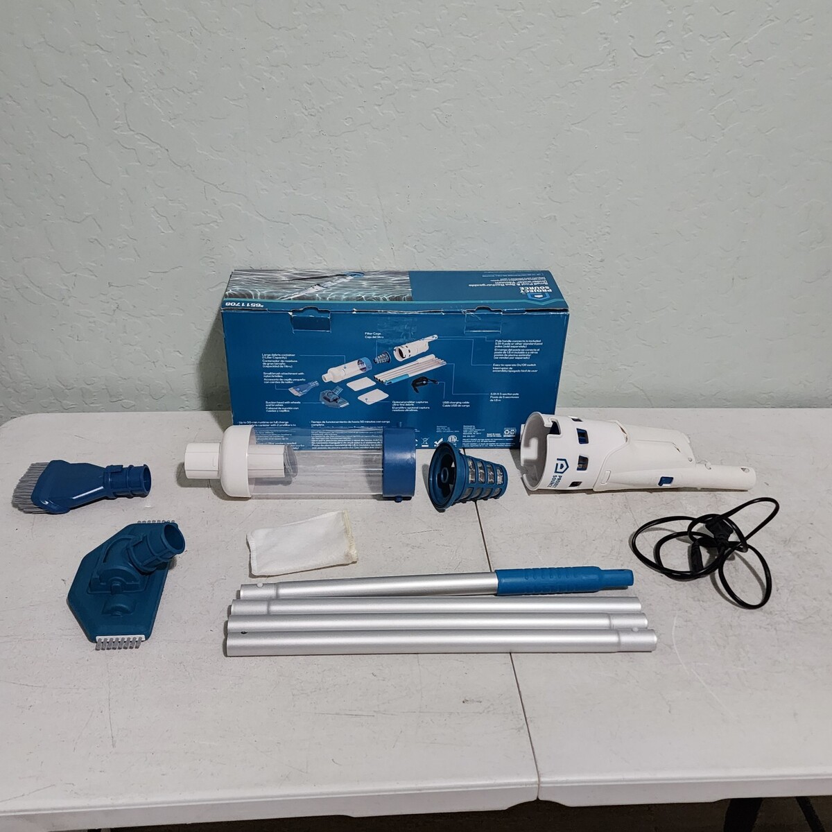 Introducing the Rechargeable Pool Vacuum, designed for optimal performance and convenience. This vacuum provides constant cleaning power for 40 minutes per charge, making pool maintenance a breeze. Featuring a large debris canister with two prefilters, it captures ultra-fine debris particles effectively. The vacuum comes with two versatile nozzles: a pivoting suction head and a flat brush head, allowing you to tackle various cleaning tasks with ease. Included is a six-foot sectional pool pole, ensuring you have everything you need for thorough pool cleaning. Industry-standard pool poles can also be used to allow for longer reach. Keep your pool sparkling clean with the Rechargeable Pool Vacuum.