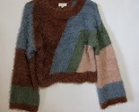 - Promesa Fuzzy Pullover Sweater Women's S Long Sleeve Top Brown Blue Colorblock