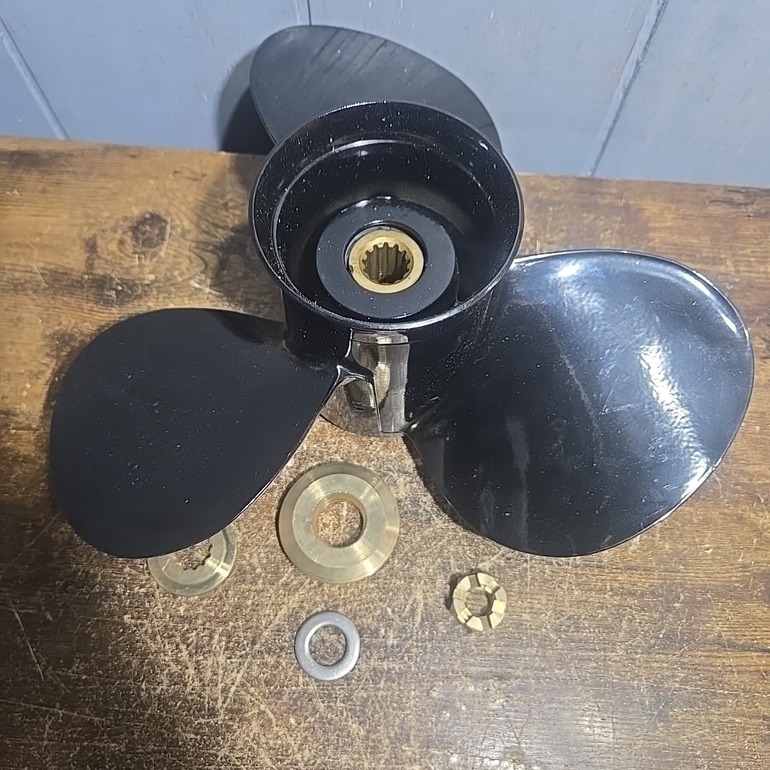 The Propeller 765181 is a solid black aluminum-alloy propeller designed for OMC Johnson Evinrude V4 outboard boat motors with 40-140 HP. It comes with a hub kit and measures 13-3/4X13 inches in size. This propeller, imported by Markgoo, weighs 8.64 pounds and is specifically designed for Johnson Evinrude OMC outboards. With its durable material and precise fit, this propeller is an essential accessory for water sports enthusiasts engaging in activities like kayaking, canoeing, and rafting.