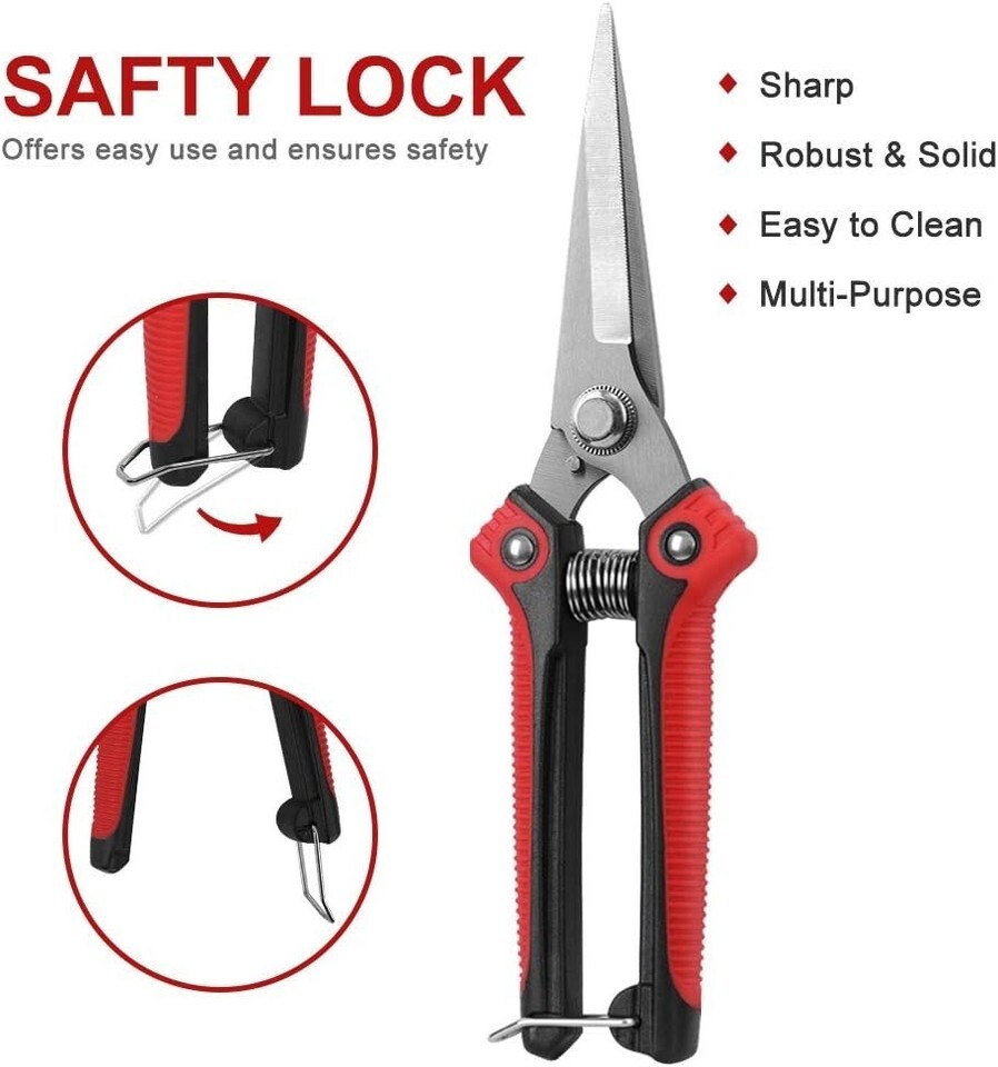 Handle Lock Design: Safety lock easily operates to prevent accidental scratches, securing the pruner when not in use.