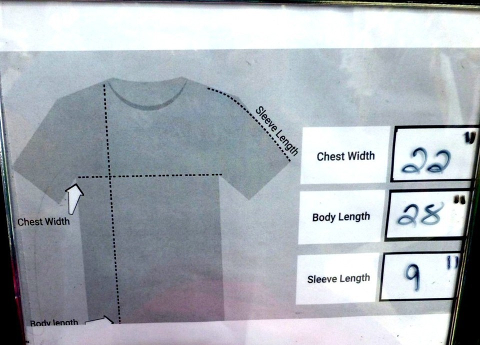Chest Width = 22 inches, Body Length = 28 inches, Sleeve Length = 9 inches