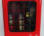 The product is a vintage Pulver Chewing Gum One Cent Dispenser made of red porcelain, featuring a design of a policeman from the 1940s. This original collectible item was manufactured in the United States, making it a unique piece for collectors of vintage vending machine memorabilia. The device would have been used to dispense small pieces of chewing gum for a penny, adding a touch of nostalgia to any collection of antique vending machine parts or vintage Americana.
