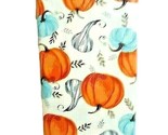 The front has a white background with a repeating pattern of blue and orange pumpkins, silver gourds, and silver and brown leaves.
