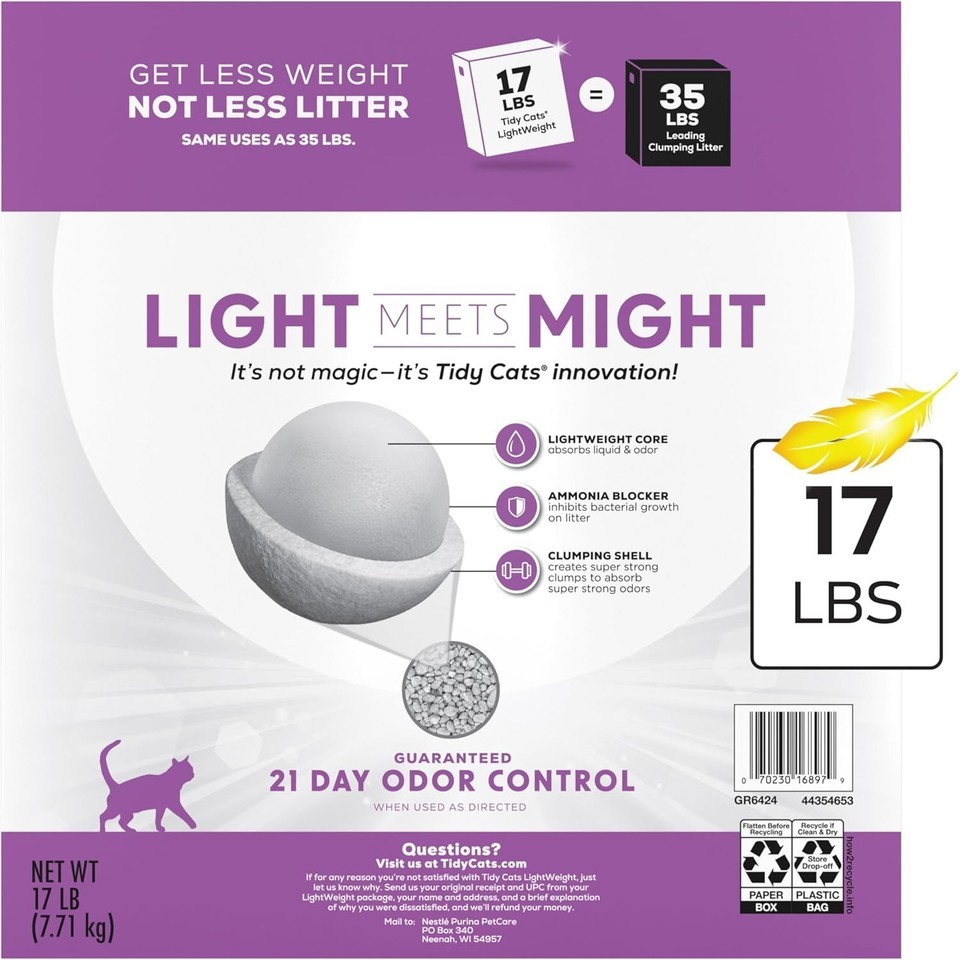 LIGHTER CAT LITTER: Tidy Cats cat litter lightweight formula is 50 percent lighter than the leading clumping litter--less weight, not less litter