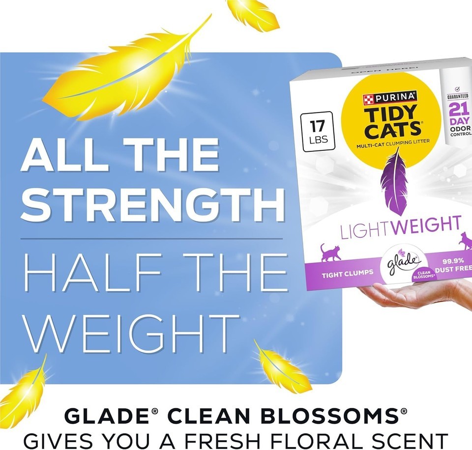 Combine powerful odor control and a pleasant scent without the pain of litterback with Purina Tidy Cats LightWeight Litter With Glade Clean Blossoms Multi-Cat Clumping, scoopable cat litter. This multi cat litter prevents ammonia odor for 21 days (when used as directed) offering great odor protection with a fresh floral scent and a fraction of the weight. Tidy Cats litter is easy to carry, weighing half as much as the leading clumping cat litter without sacrificing litter amount. The low dust cat litter is easy to use and is 99.9 percent dust free and forms strong, tight clumps for quick and easy scooping. This multi cat litter offers an option for large cat families with a powerfully absorbent scented cat litter that can go into every cat litter box to make each box a welcoming place for your cats. Add Purina Tidy Cats LightWeight With Glade Clean Blossoms clumping cat litter odor control to your cat?s litter box for a reliable litter with the performance you expect with less weight.