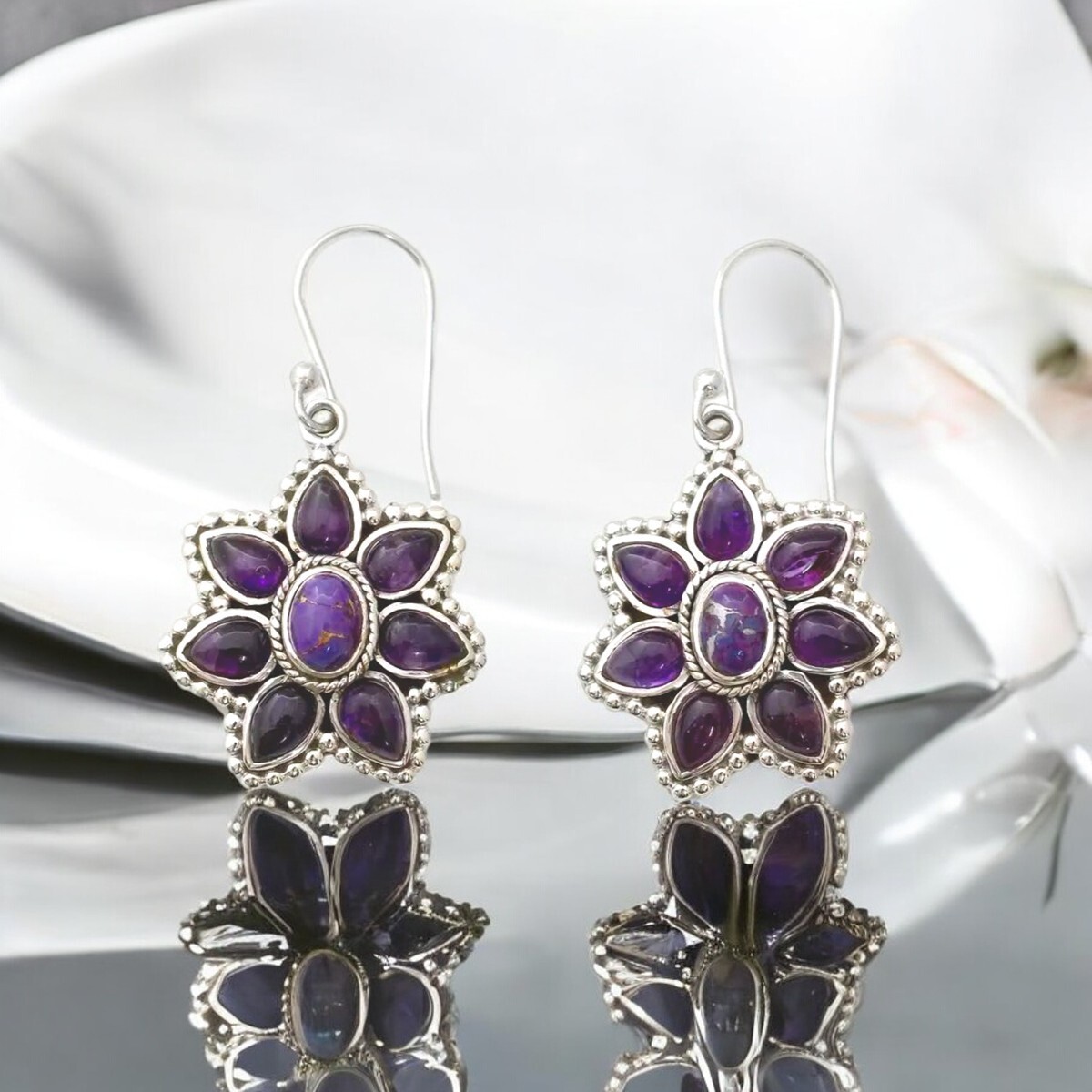 Add a touch of bohemian charm with these purple crystal flower dangle drop earrings. Featuring a unique floral design with sparkling purple stones, these earrings are perfect for casual wear, parties, or gifting to someone special.