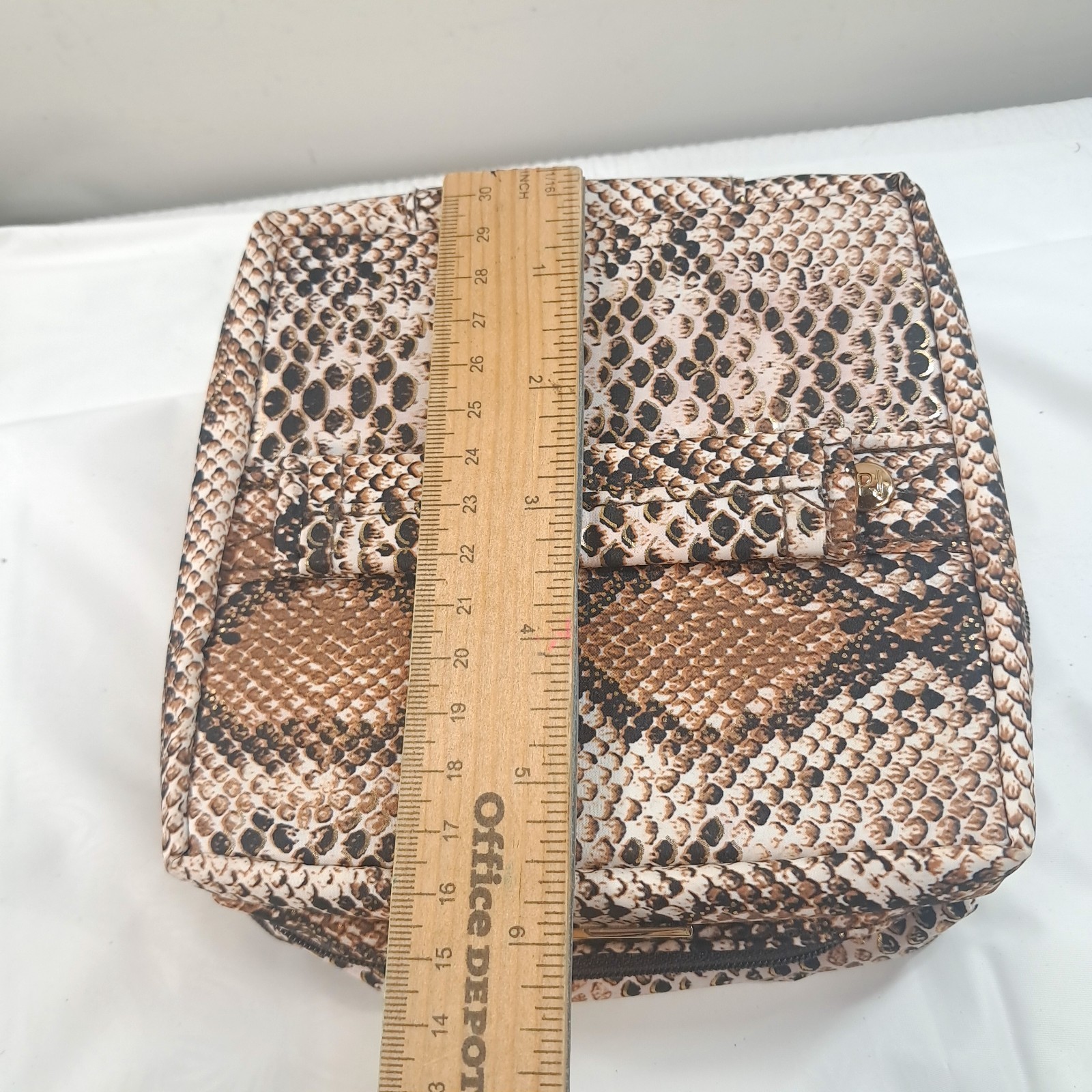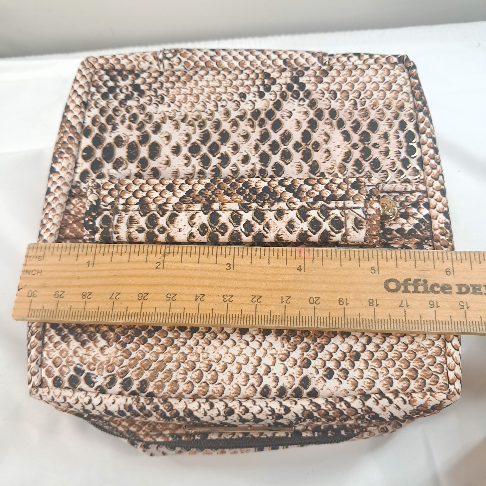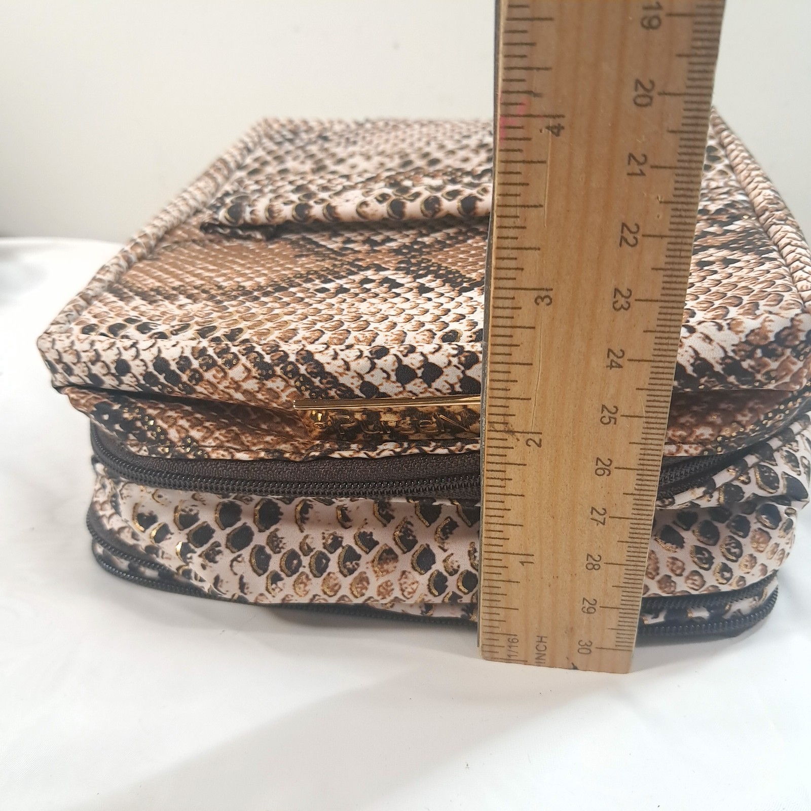 Very good condition, but the clear display pouches have some marks as shown. Expandable. Brown snake print. See pics for measurements and details.