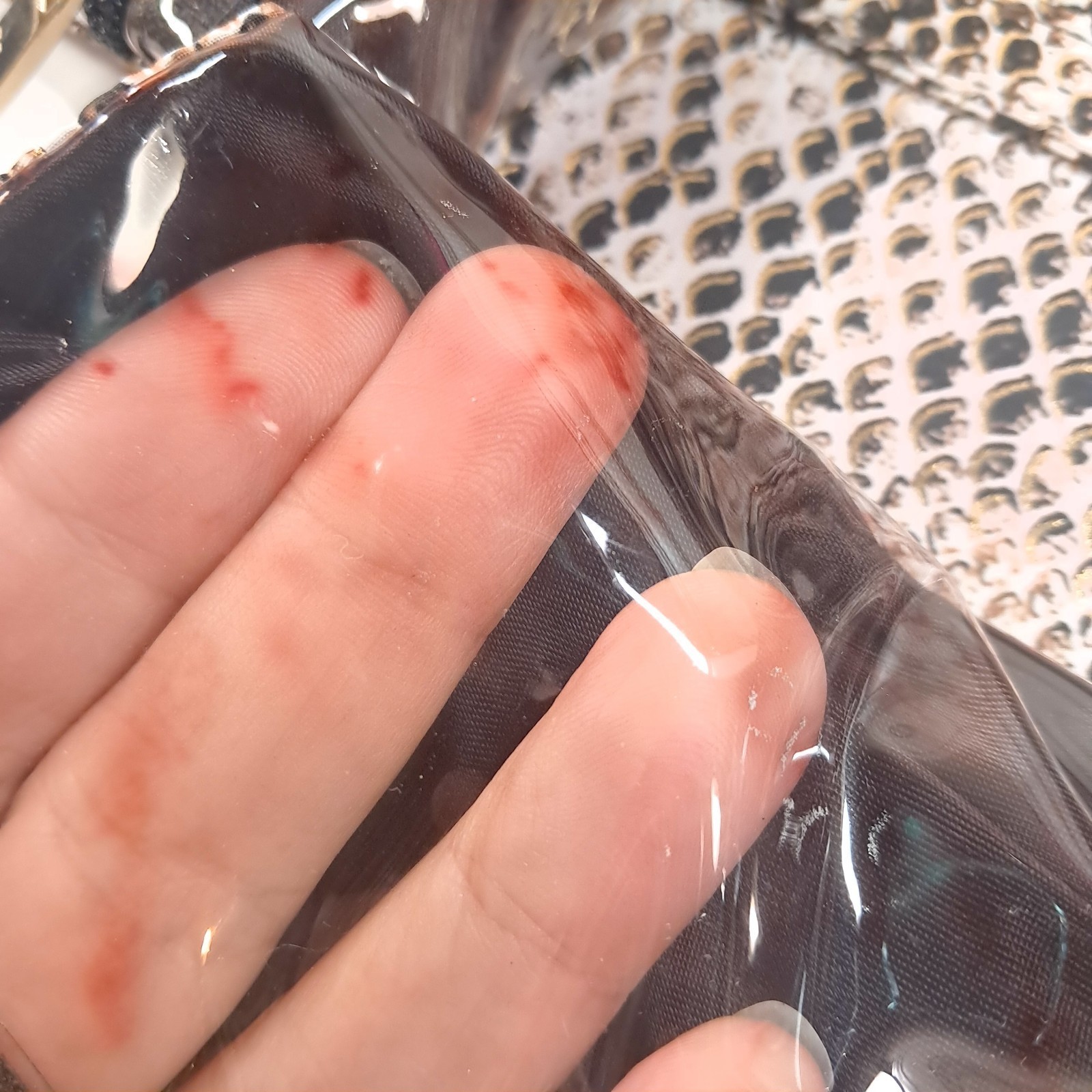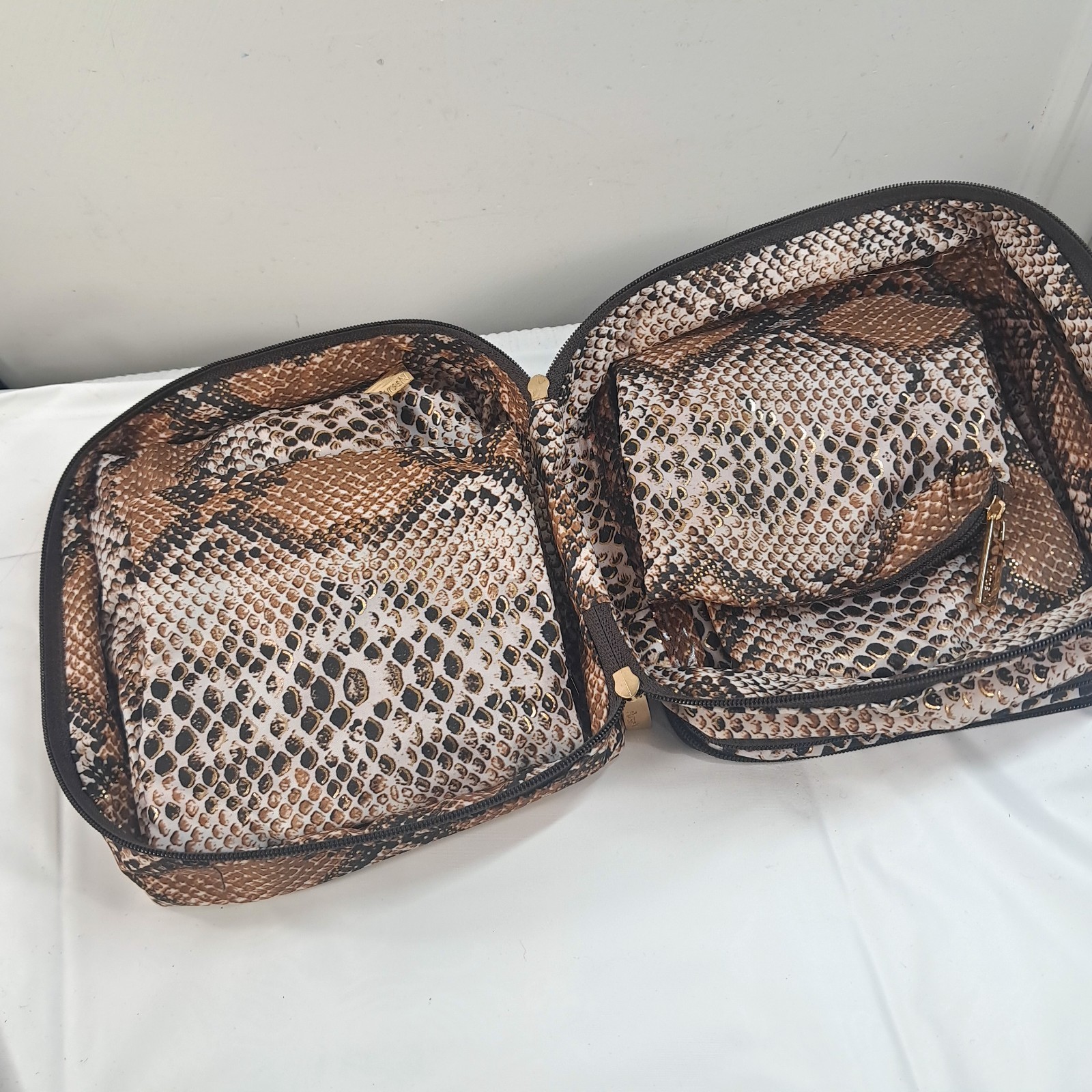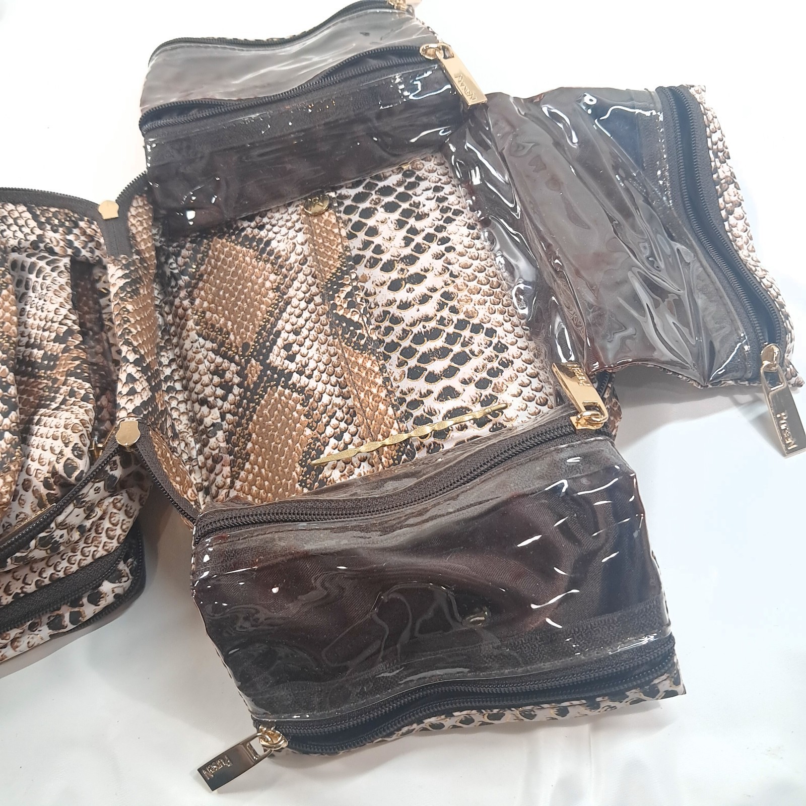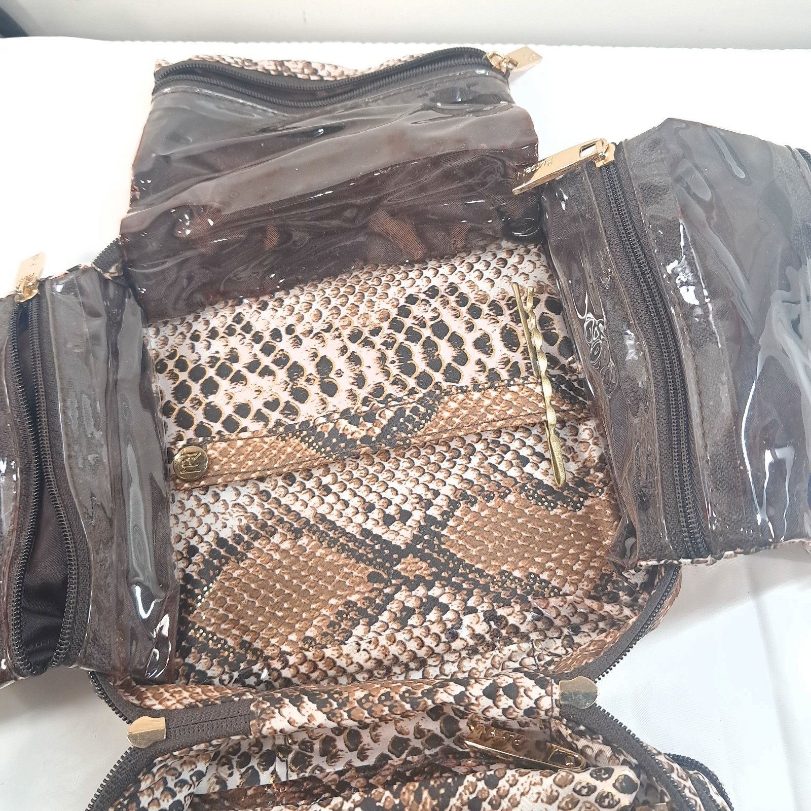 Very good condition, but the clear display pouches have some marks as shown. Expandable. Brown snake print. See pics for measurements and details.