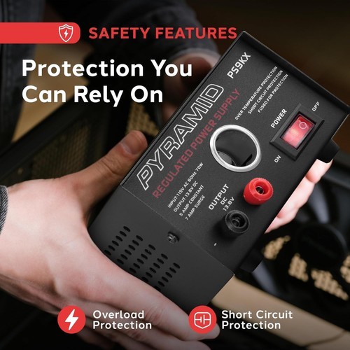 The Pyramid Car Audio PS9KX 70 Watt 5 Amp Power Supply provides convenient and reliable AC to DC power performance. Universal hardwired screw-type connection terminals are hassle-free and ensure compatibility with a wide range of device equipment and components. Simple electronic plug-in operation provides a constant source of DC voltage, allowing for quick and consistent power conversion. Switch-activated power control eliminates the need of an external battery or additional power source?while the built-in electronic overload and short-circuit protection ensure safety of the operator and any connected electrical devices. The Pyramid Bench Power Supply makes for a great addition to any hobbyist work desk or equipment testing station.