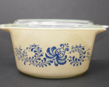 The Pyrex Homestead Baking Dish is a two-piece round baking dish set made of glass in a cream color. With a capacity of 1 L, this casserole baking dish is ideal for baking and serving dishes. This measures approx. 7.5" wide including the handles with 6" diameter and 3.25" height. The bowl does have a few small marks. Comes with a clear glass lid numbered 470-C which has some scratches and a small chip on the edge of one handle.