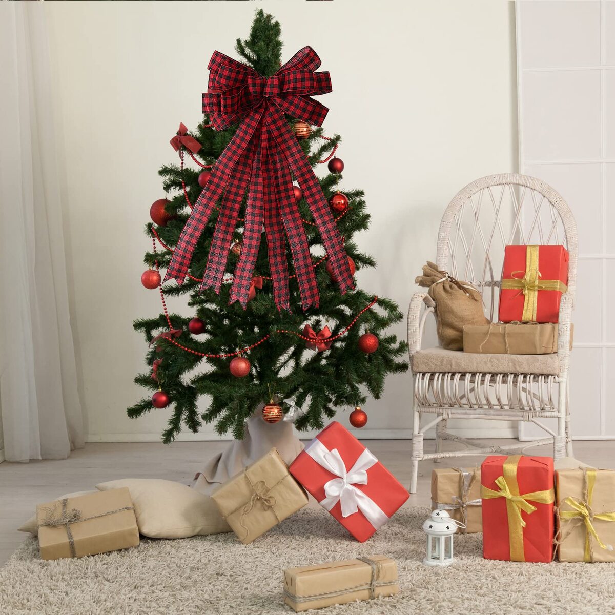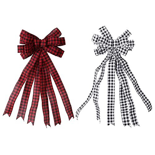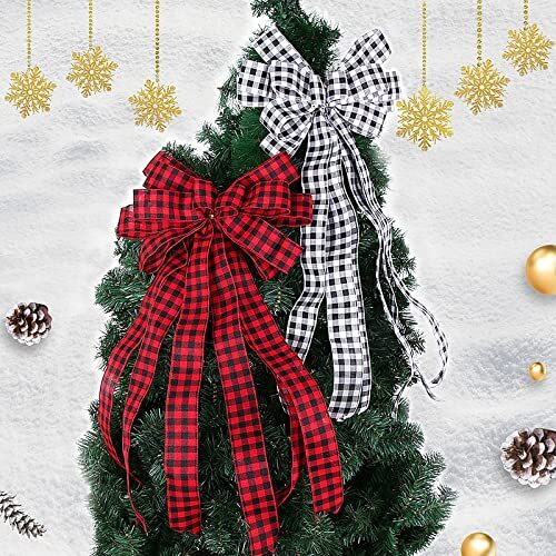 - QSDGFH 2pcs Christmas Bows Tree Topper, 25.6in Red/White Buffalo Plaid Bow Holid