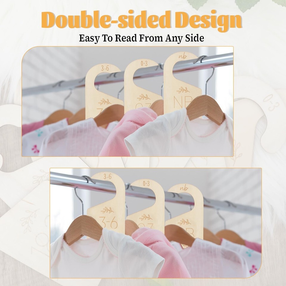 Qianyu Set of 7 Closet Dividers for Baby Clothes Wooden Double-Sided Toddler Clothes Organizer from Newborn to 24 Months Adorable Nursery Decor Hanger Dividers Gender Neutral Baby ItemsCategory: Closet Divider Clothes Storage BoardColor: BrownMaterial: PinewoodFunction: Clothes DividerProduct Size: 6.69 3.32 0.11 inches/17 8.2 0.3cmPacking Method: BagProduct Weight: 2.56oz/72.5gPacking List: 7pcs Closet Divider Clothes Storage BoardFeatures1. The baby clothes organizer elegant wooden material matches the cute design. In addition to being an excellent baby closet dividers, these dividers are also beautiful baby nursery decor for your baby boy or baby girl.2. The baby size closet dividers are printed with double-sided large characters on the entire board, baby closet organizer for nursery parents can easily and clearly see even if the baby closet dividers are not standing upright. In addition, the printed text will not fade.3. Considering the smaller size of baby clothes, the size of the closet dividers for baby clothes is designed to be compact to accommodate the size of baby clothes.