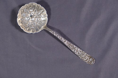 Sterling Silver SERVING SPOON PIERCED 8 5/8" ORIGINAL in the pattern QUADRILLE BY KIRK. It is NOT monogrammed and is in excellent condition.
