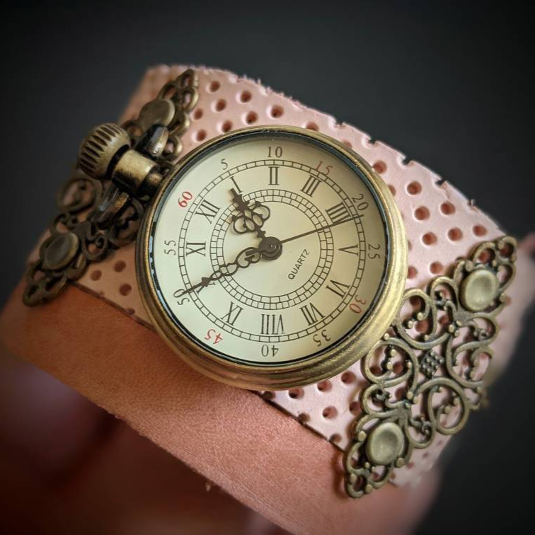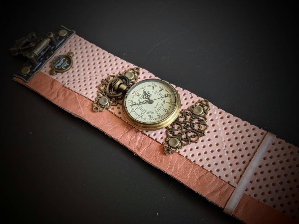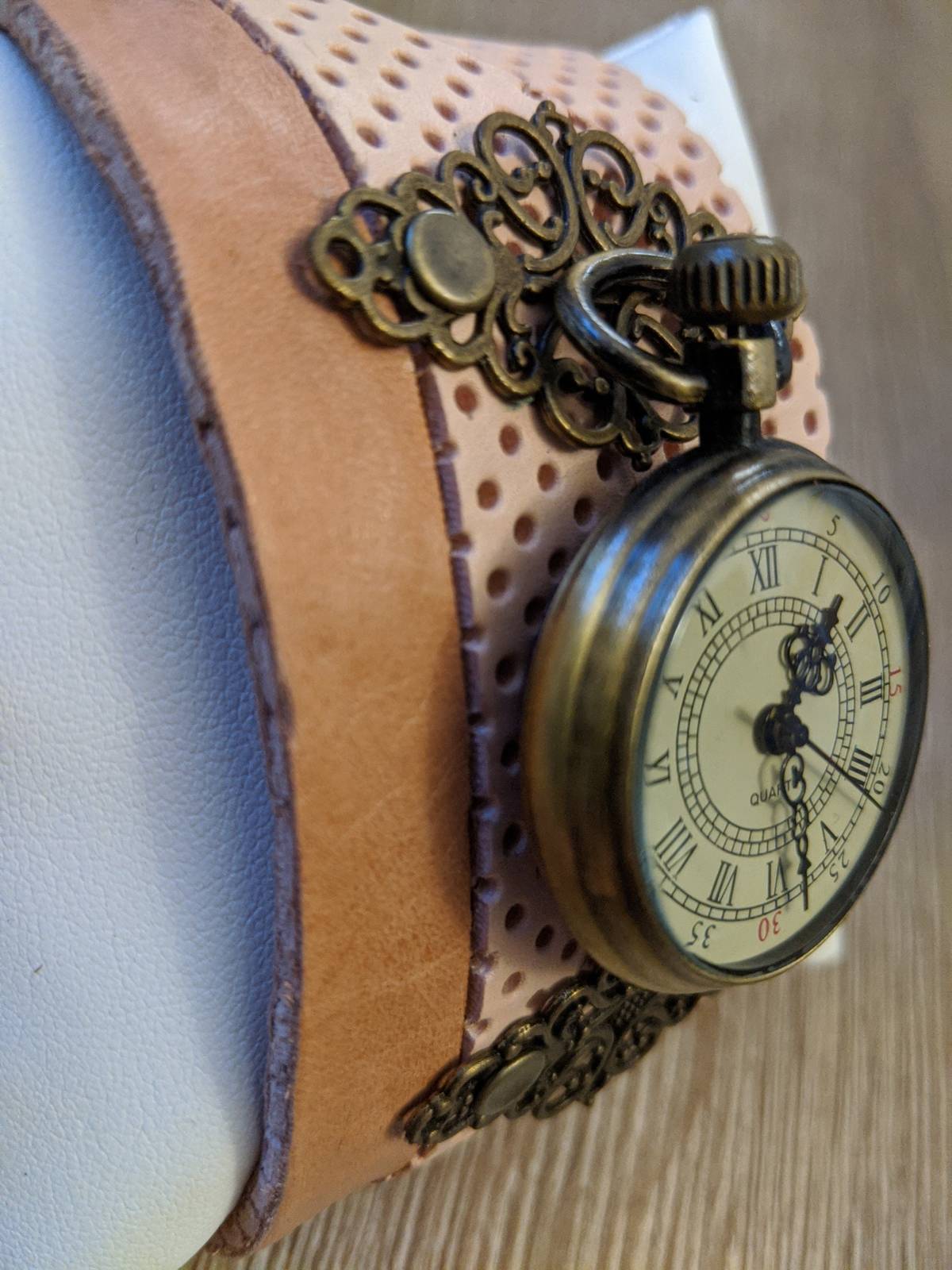 Steampunk watch , one-of-a-kind, genuine leather, hand made in the USA. Quality battery watch included. Comfortable and cushioned inside. Perfect for any steampunk enthusiast or for everyday (like we do!).
