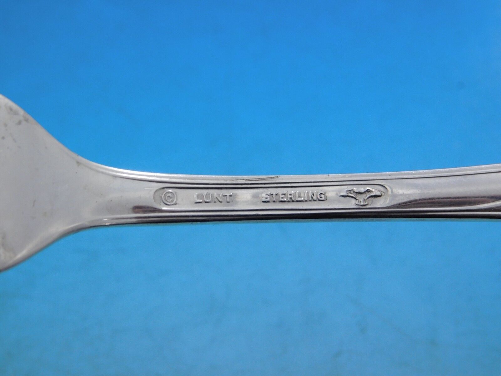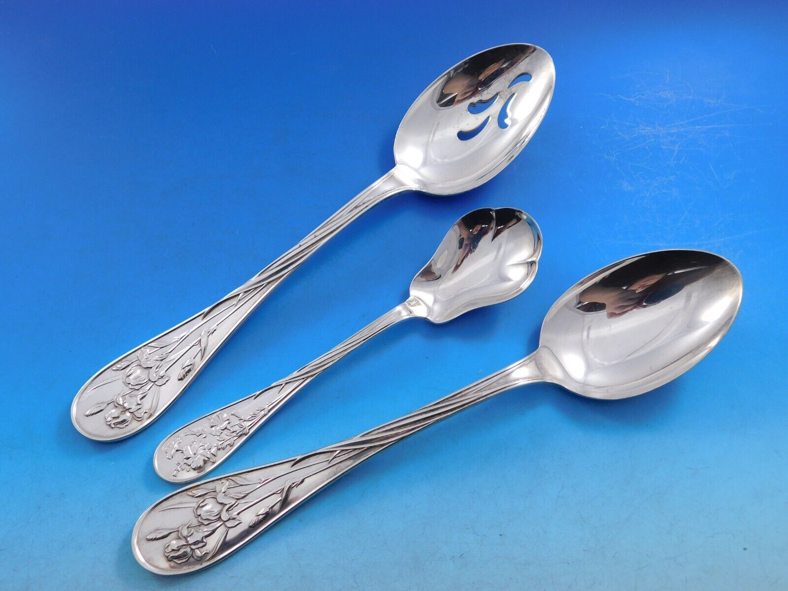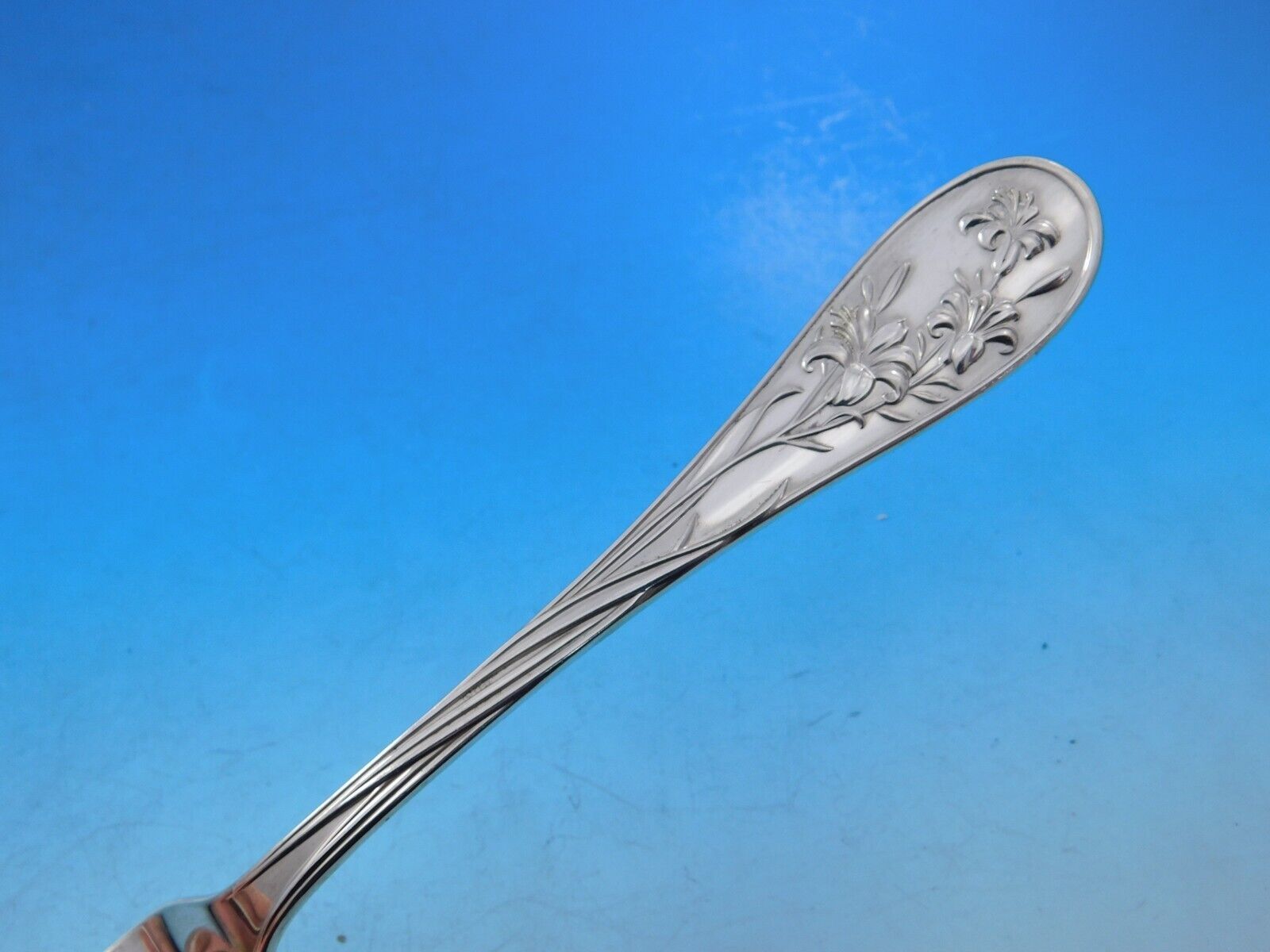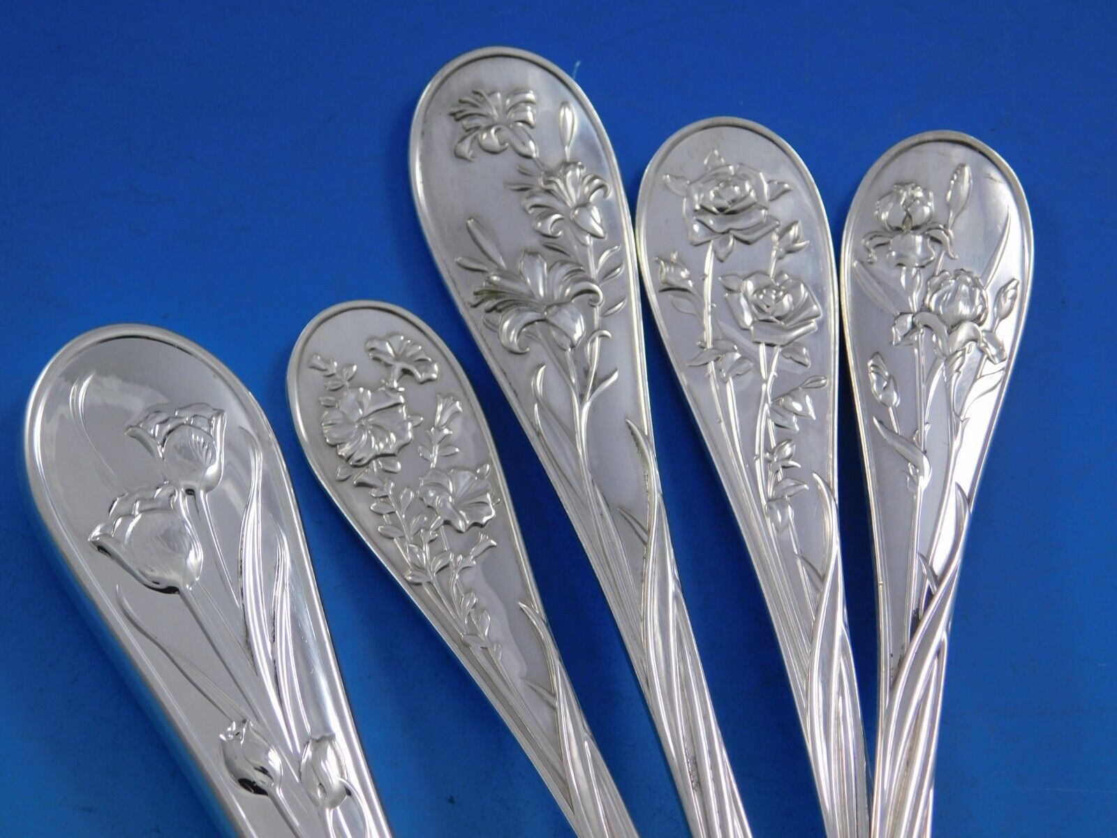 Displaying a gleaming finish, Quintessence by Lunt has a beautiful teardrop profile with different, intricate flower motifs on each piece. Pieces are heavy and well balanced.