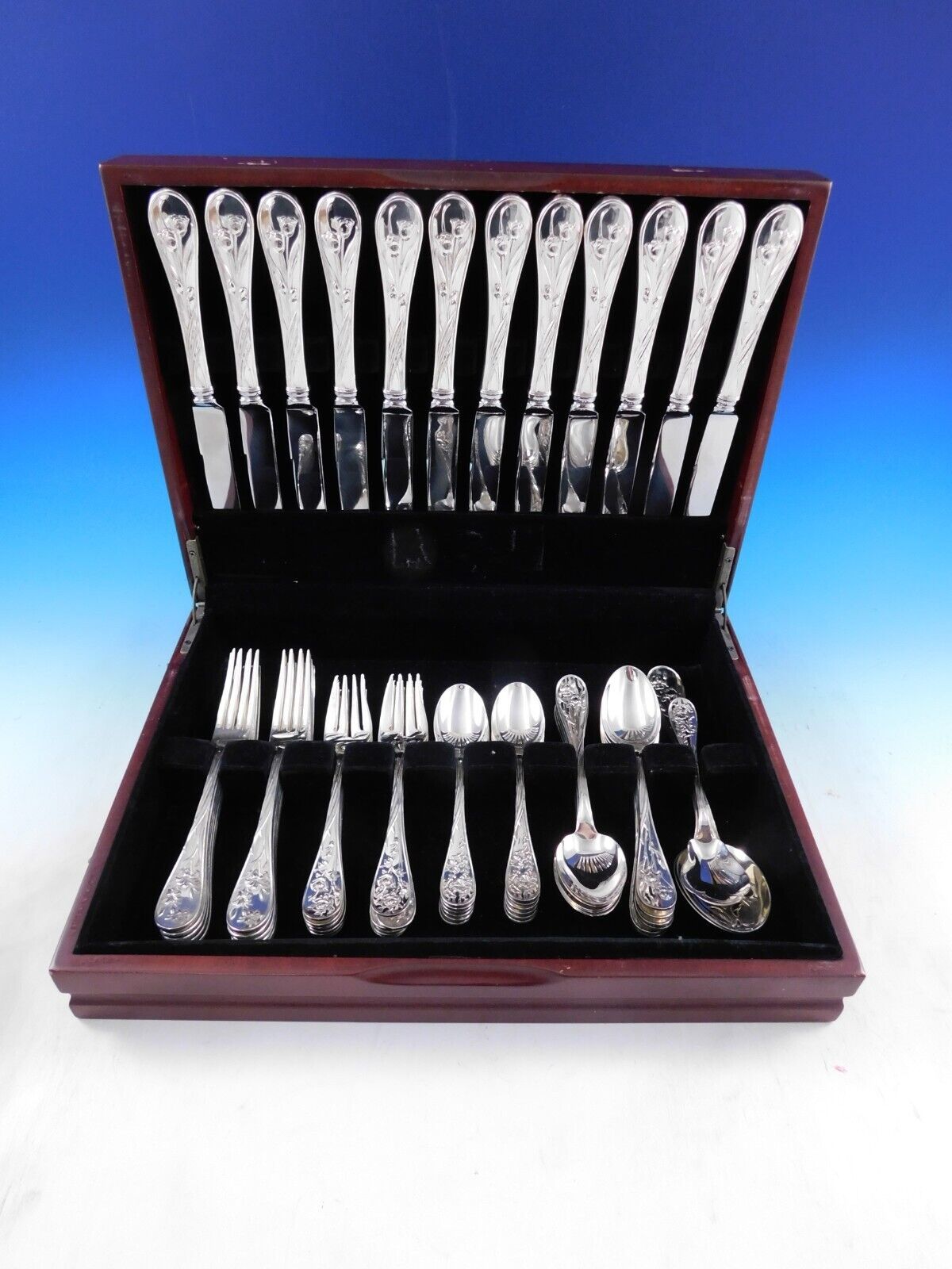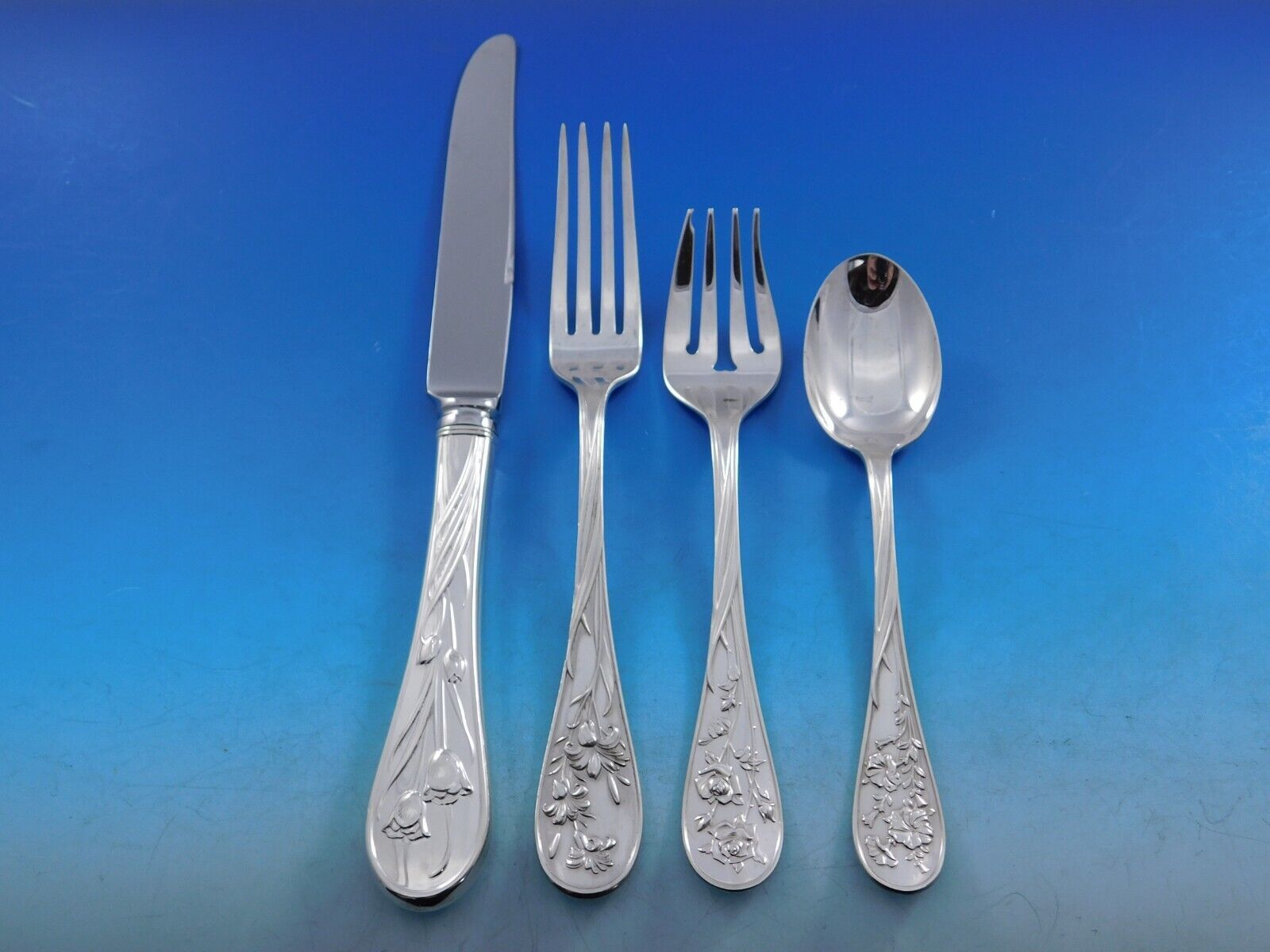 Scarce multi-motif floral Quintessence by Lunt sterling silver Flatware set, 63 pieces. This set includes:
