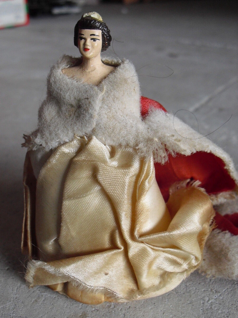 Very nice, antique chalkware figurine of the Queen of England, with black hair, white outfit and long red and white train. It's a really unique older piece, probably mid 1900s if not older. and in good shape with the crown on the head looking like it's a little worn away, browning of the white outfit and general wear and tattering of the train. About 3 7/8 inches tall. Ever see one before?