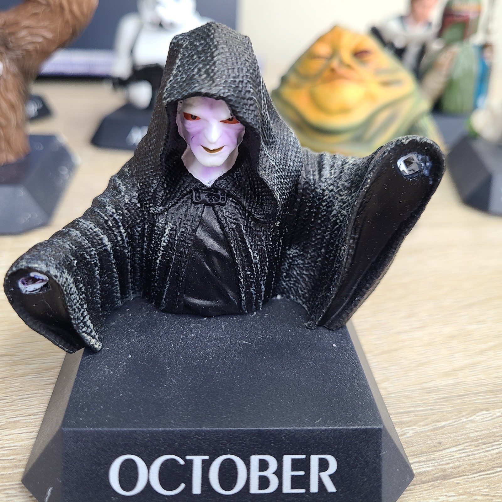 Palpatine/October is broken as shown. The hands/lightning fell off. It looks like it could be glued back on. Otherwise all other figures look to be in good condition.
