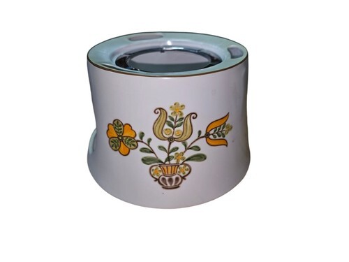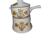 This is a rare Noritake Progression China fondue set from the 1960s. The set includes a three-piece stoneware bowl set with a warmer base, featuring a flower-themed pattern called Homecoming. It was made in Japan and is an original, vintage piece. The set is hand wash only and is part of the Progression collection.