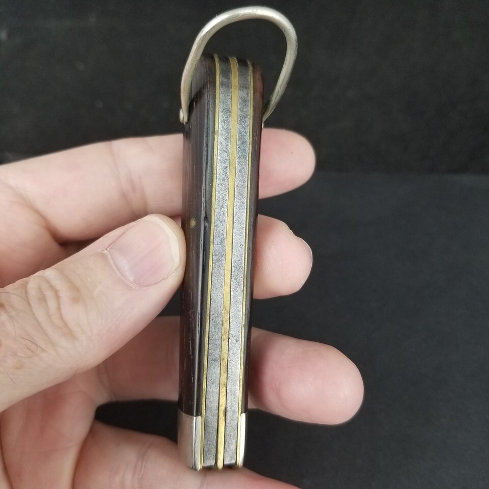 Scales are in great shape with no cracks or chips. Still has its bail. Both blades open and close. The knife does have a half stop and a brass lock. Snap left on open. No snap on close. SEE PICTURES.