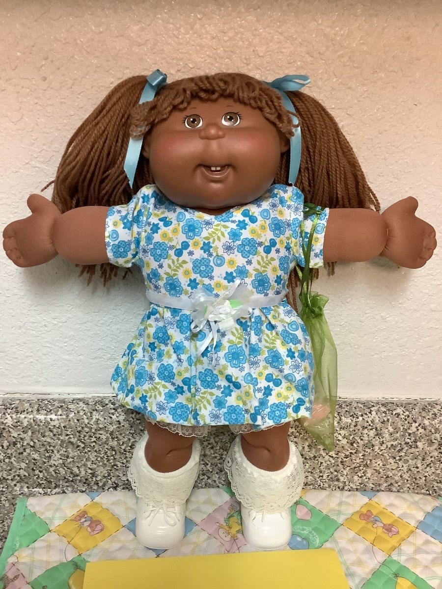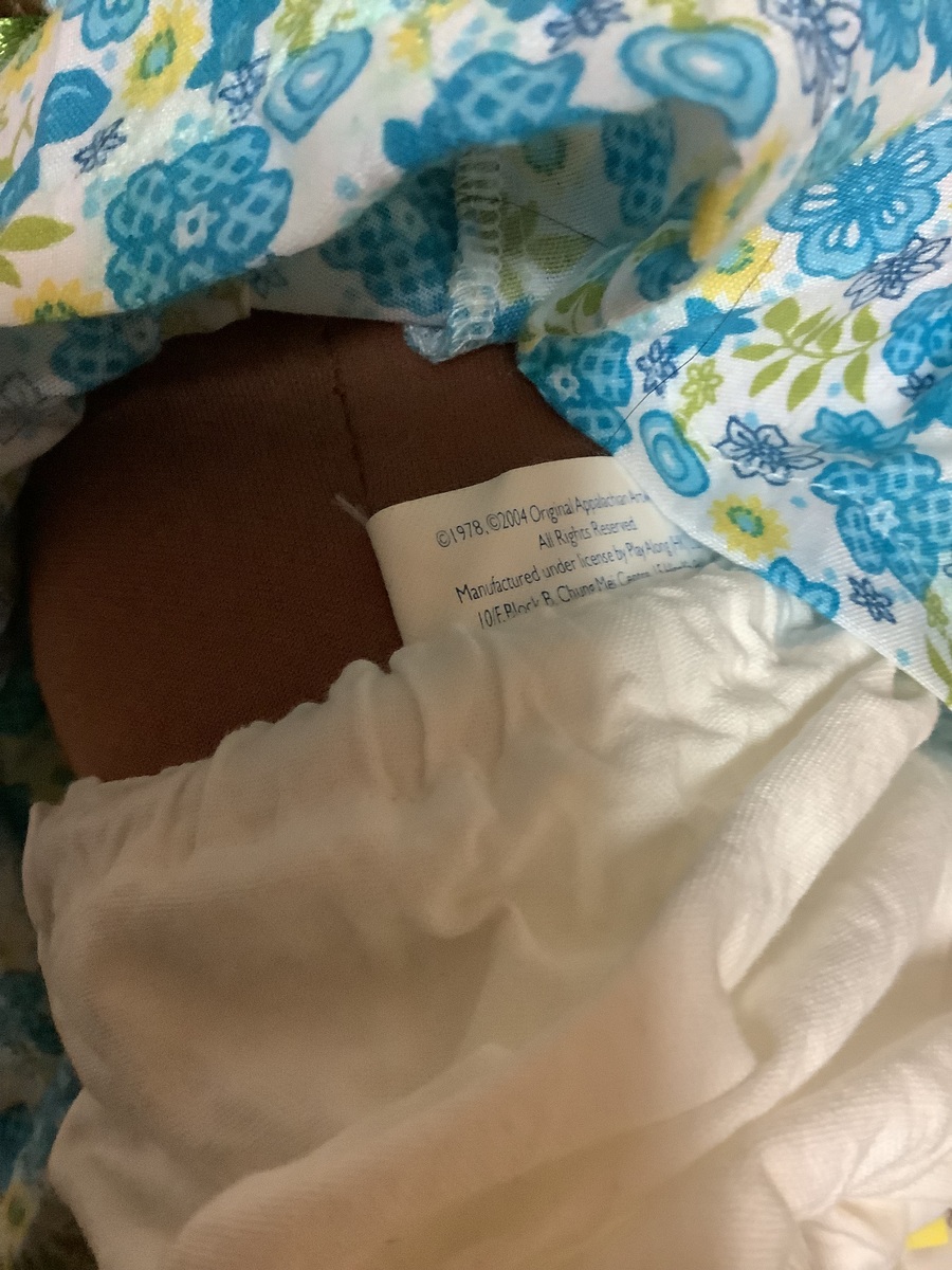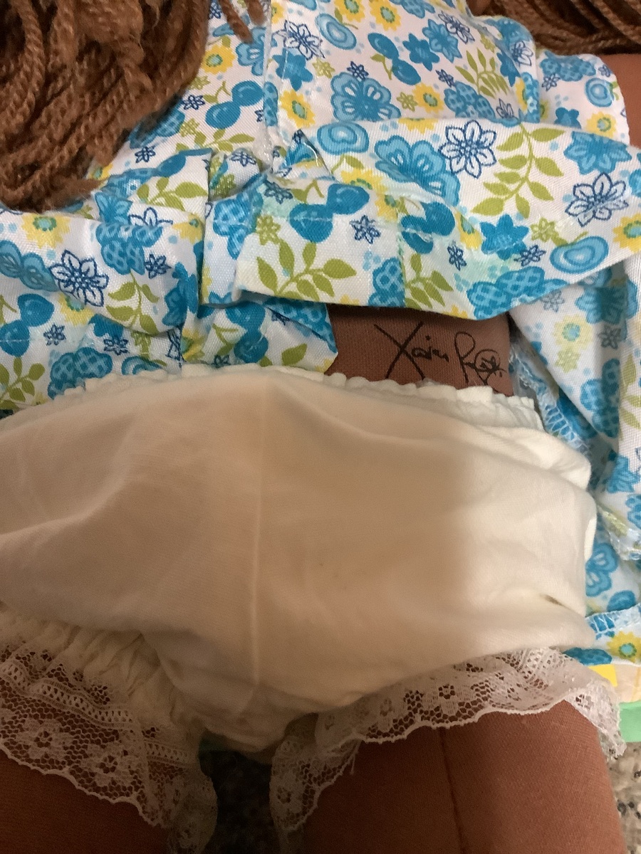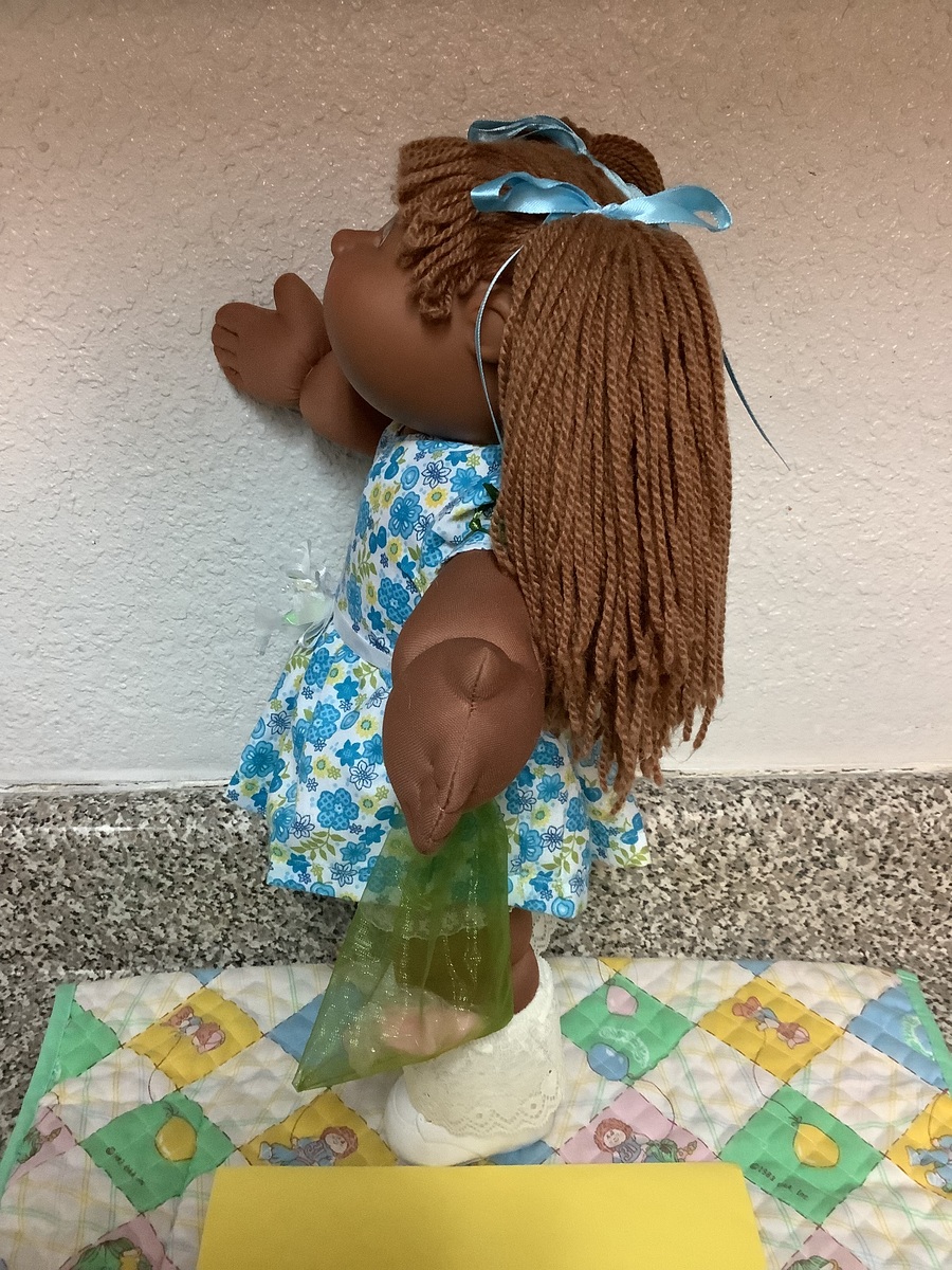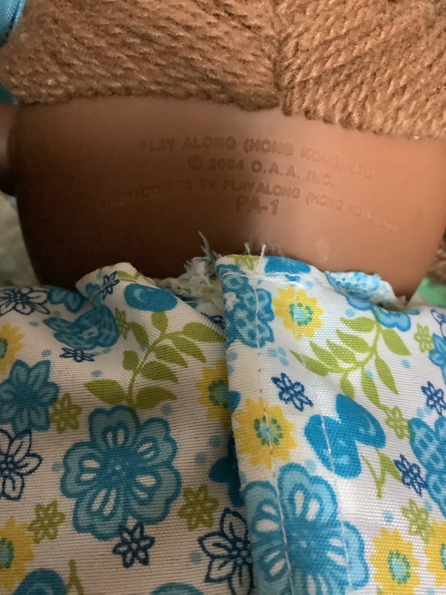 This little girl is a harder to find African American Play Along girl-a PA-1 from 2004 to be exact. She is so cute with her brown double ponies and pretty brown eyes. Her side tag is still intact and so is her black signature as she is the first Play Along head mold. She is wearing a BRAND NEW dress and BRAND NEW handmade bloomers that I made for her. She is also wearing a BRAND NEW diaper, pretty lace socks, and shoes. She is in very good vintage condition for her age of exactly 21 almost 22 but please bear in mind that she is still a vintage item-not new and therefore not perfect but she has definitely been restored. She can stand all by herself!! Please see all pics as they are part of the description. She comes from my smoke free home although I am not her original owner. Sold AS IS.