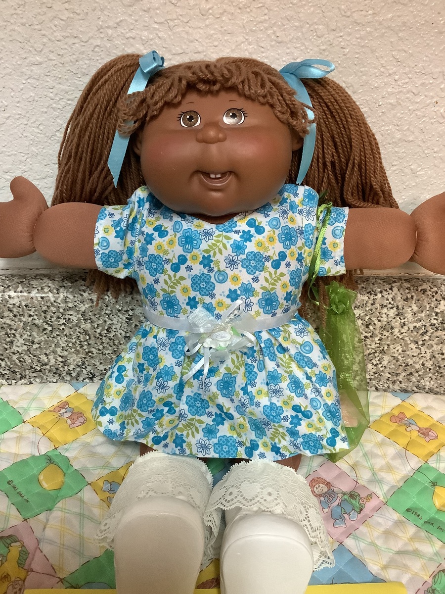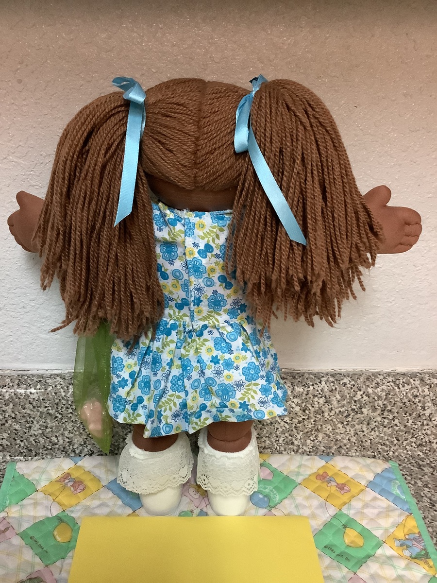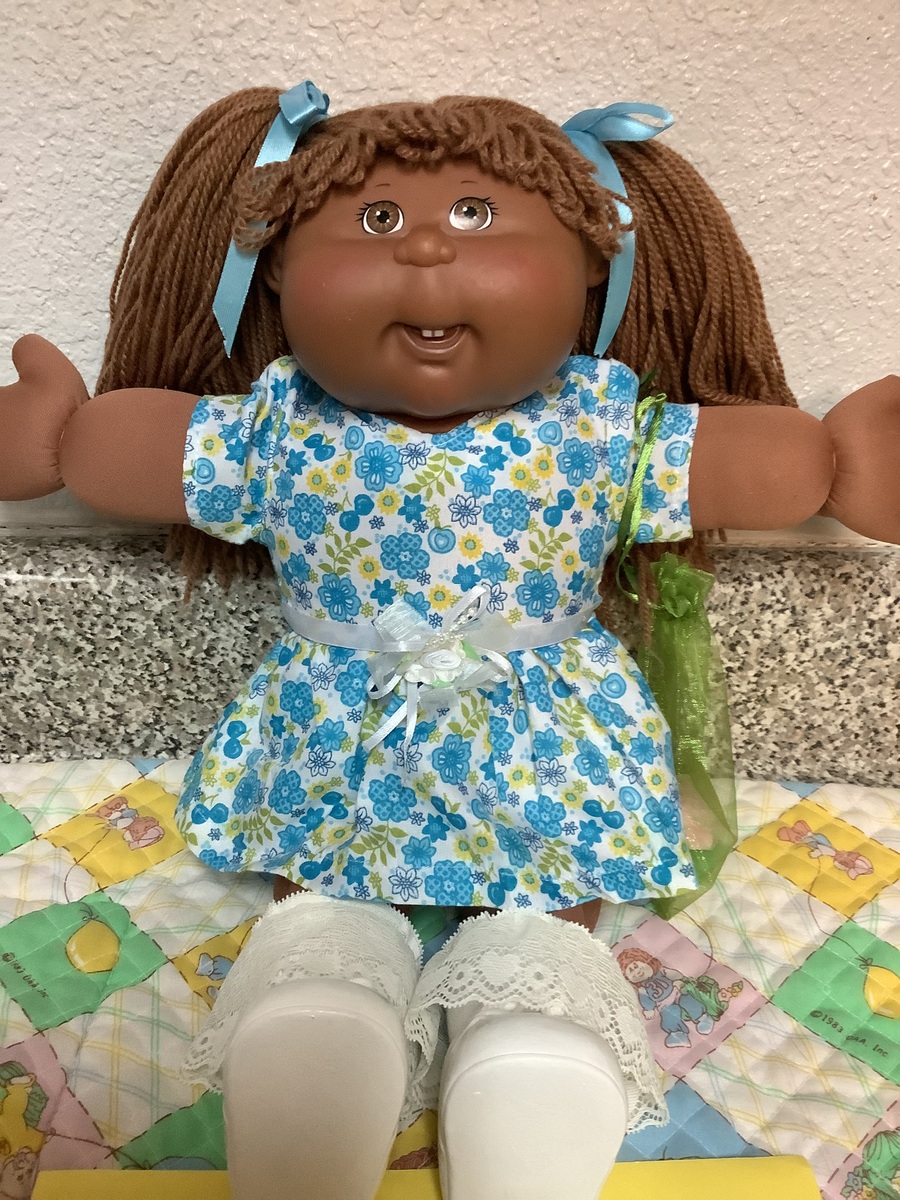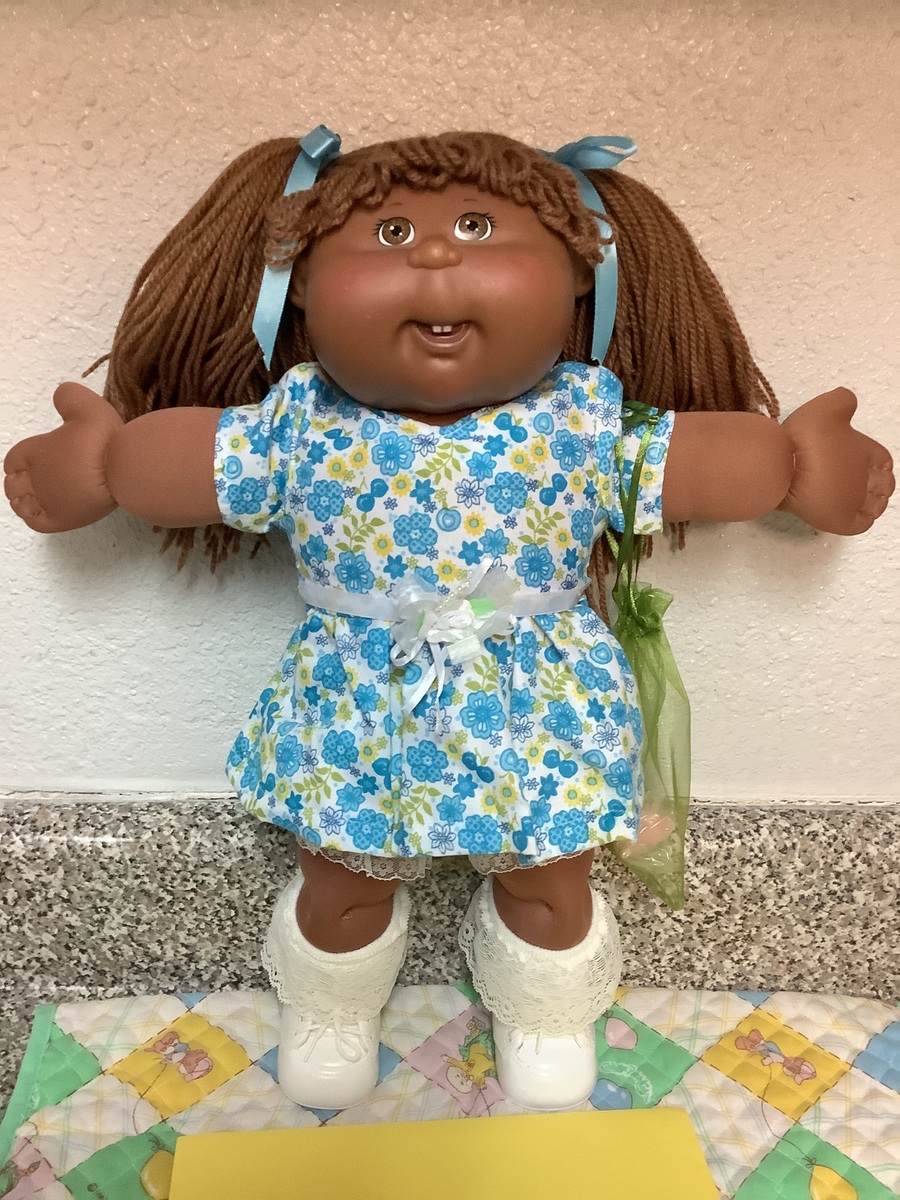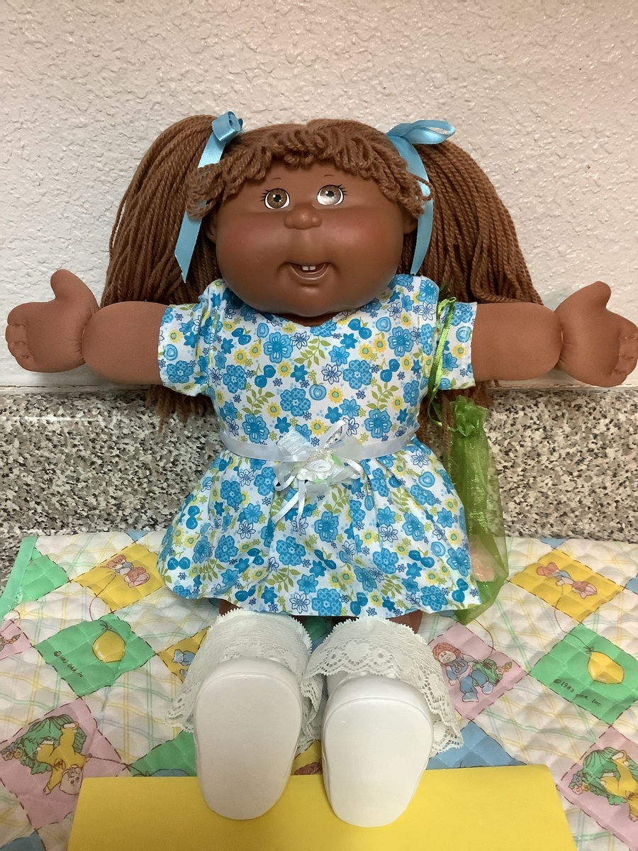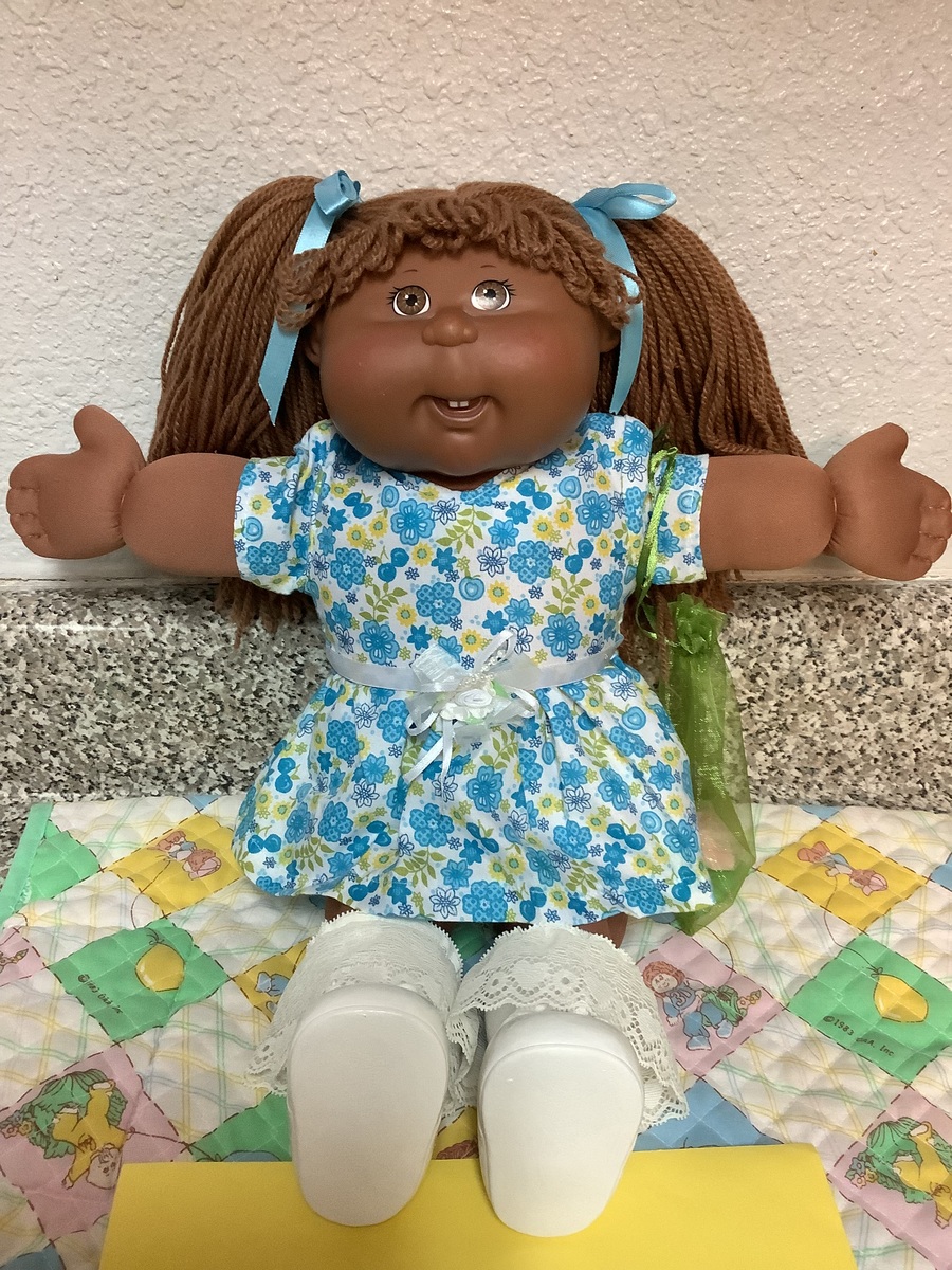 This little girl is a harder to find African American Play Along girl-a PA-1 from 2004 to be exact. She is so cute with her brown double ponies and pretty brown eyes. Her side tag is still intact and so is her black signature as she is the first Play Along head mold. She is wearing a BRAND NEW dress and BRAND NEW handmade bloomers that I made for her. She is also wearing a BRAND NEW diaper, pretty lace socks, and shoes. She is in very good vintage condition for her age of exactly 21 almost 22 but please bear in mind that she is still a vintage item-not new and therefore not perfect but she has definitely been restored. She can stand all by herself!! Please see all pics as they are part of the description. She comes from my smoke free home although I am not her original owner. Sold AS IS.