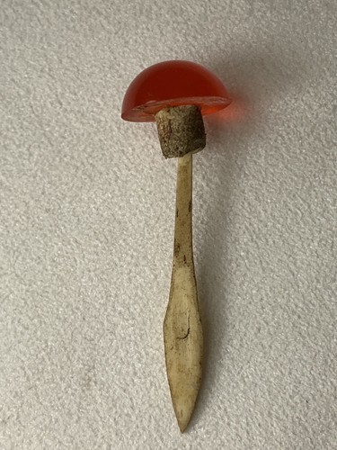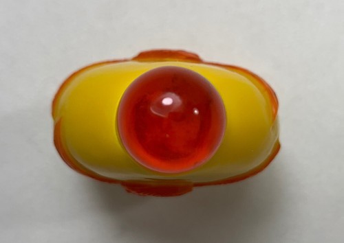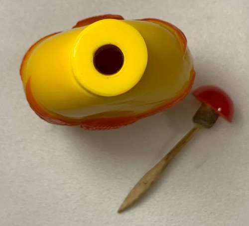 This is a really neat, and very hard to find item. It is a small jar/bottle made of opaque yellow glass, with a open winged orange owl pressed on top of both sides. Topper is either a red or a darker orange, not sure which. There are no clues that I found to figure out the maker or age, but maybe you could take a look and tell by the design.