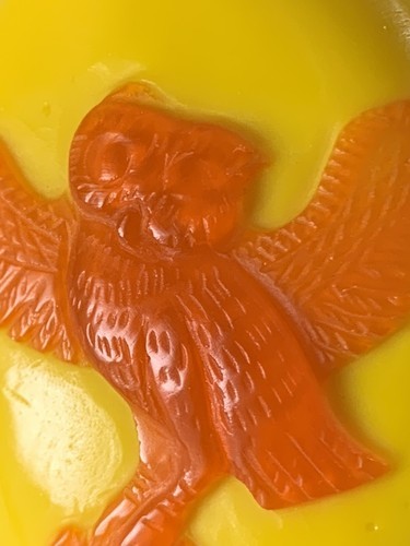 RARE Vintage Yellow Orange Glass Snuff Bottle Jar - Opened Winged Owl 2 3/4"