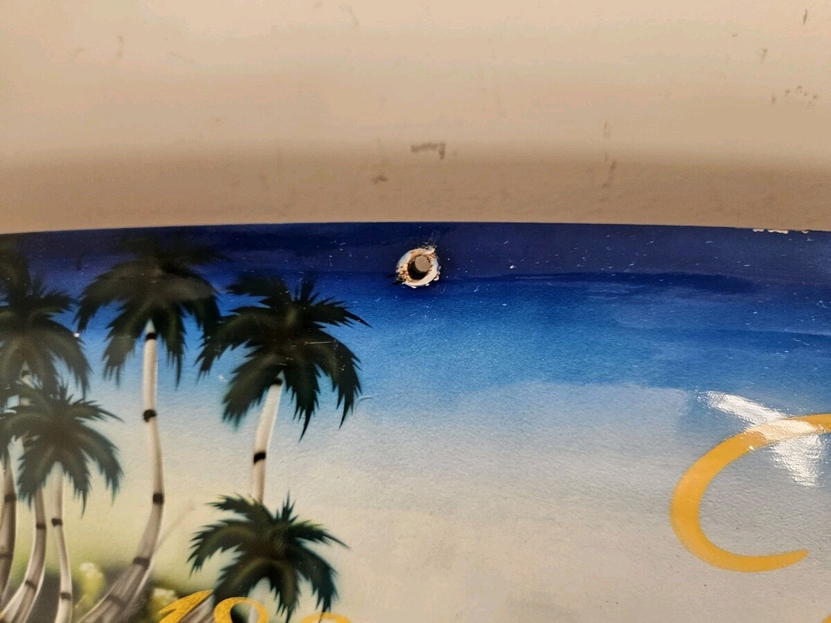 This is a really cool double sided sign. It is meant to hang from a ceiling. It measures 39" long x 9.25" wide. I noticed in the pictures that there is a glare from lights. There are a couple very tiny chips that aren't noticeable at all. There are 2 grommets missing as well. The tip of the surfboard is slightly banged up as well. Supper cool sign that is hard to find! Be sure to check out my pictures for complete description. Please contact me with questions, and be sure to check out my other items as I will combine shipments to save you money on shipping. Thank you for looking.