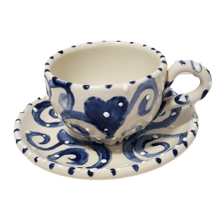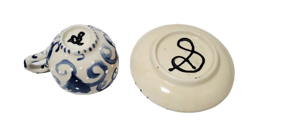 RARE Vtg Cup Saucer White Textured Embossed Dots Heart Blue Swirl Signed