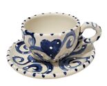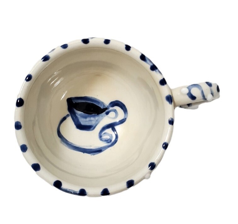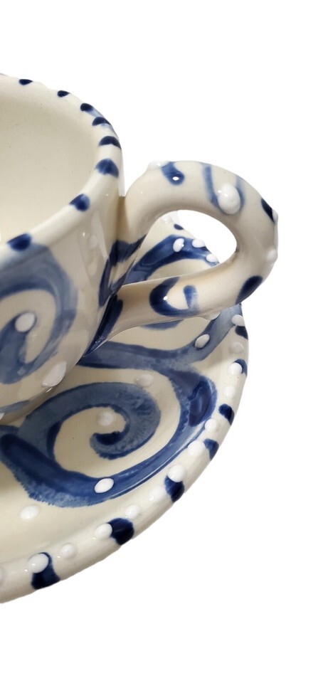 - RARE Vtg Cup & Saucer White Textured Embossed Dots Heart Blue Swirl Signed &