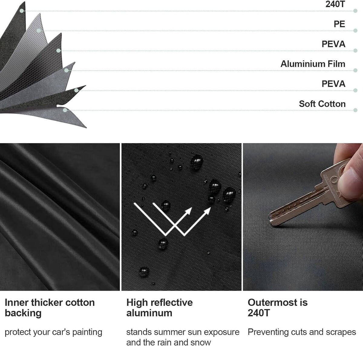 TheToyota RAV4 cover is made of 240T polyester taffeta. fabric, Composite layer, black waterproof coating, soft lint layer,Durable,Non-Fading, Anti-Ultraviolet, and 100% Waterproof.uitable for Outdoor and Indoor Use.