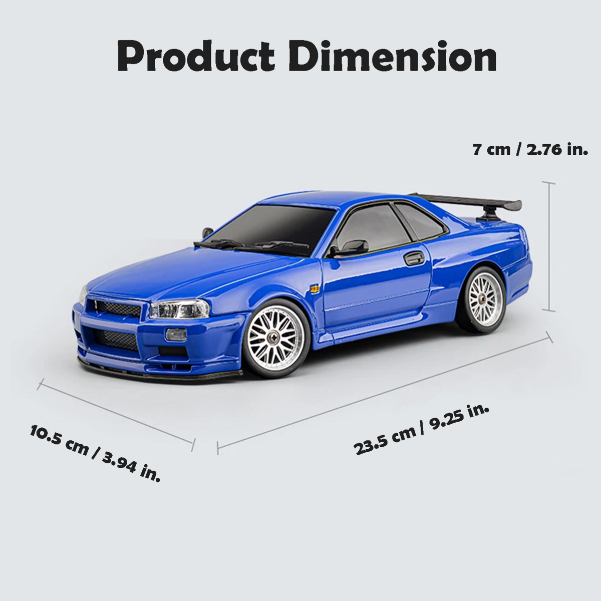 1/18 Restore the classic GT-R R34 Model and the appearance is completed in the actual proportion. Boutique drift, multi -link design. 1/18 RTR RC Drift Car GTR R34 is a high-performance drift car features a gyro system for precise control, LED headlights, and a realistic alloy body shell.