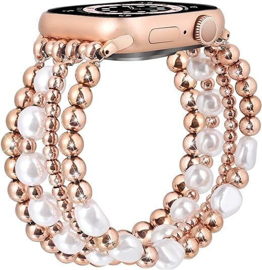 Compatible with Apple Watch: The bling pearl beaded iphone iwatch bands are compatible with 42mm/44mm/45mm apple watch series Se 9 8 7 6 5 4 3 2 1, and the imported cord can be stretched for 5.3-6.2 inches wrist.
