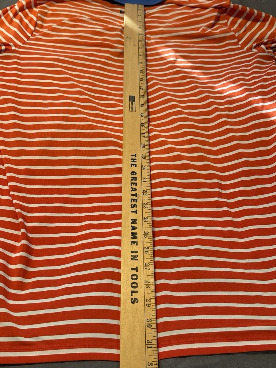 Elevate your golf apparel with this premium RLX Ralph Lauren polo, featuring official embroidery from The Open Championship ? Royal Liverpool 2014. Tournament polos from RLX are always in demand, and this bold orange-and-white striped design with a blue contrast collar is a standout.
