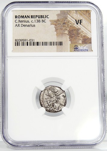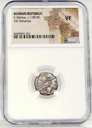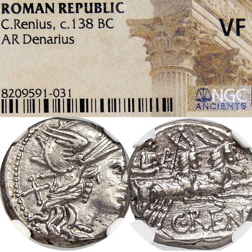 - ROMA/JUNO 2 Goat Chariot. Renia 1. NGC Certified VF. 138 BC. Roman Denarius Coin