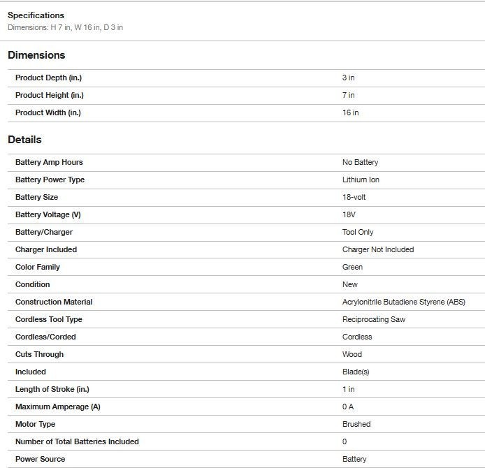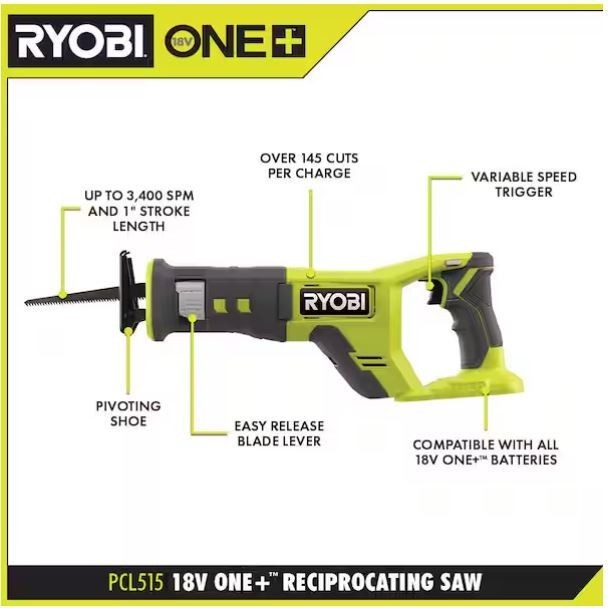 - RYOBI 18V Cordless Reciprocating Saw (Tool Only)