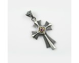 This beautiful pendant features a radiant cross design with a natural amethyst stone at the center.