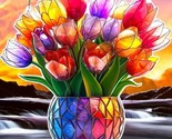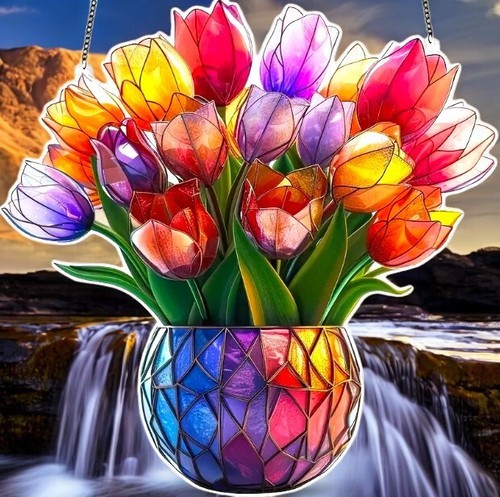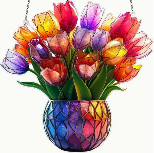 This 9-inch piece features vivid tulips in a colorful mosaic vase, with details that reflect light beautifully across any window or sunlit space. Though it looks like stained glass, it?s made from durable, lightweight acrylic, making it easy to hang and enjoy without worry.