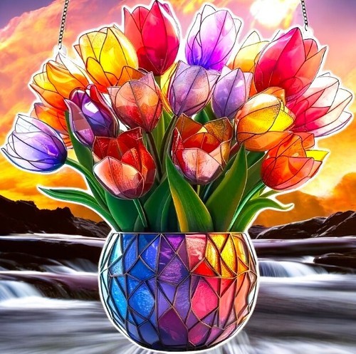 Bring vibrant floral beauty into your home with this rainbow tulip bouquet suncatcher, designed in a Faux Stained Glass Acrylic Art on flat acrylic.