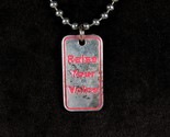 The rectangular pendant is decorated with a red-pink enamel. On one side it reads "RAISE YOUR VOICE" and the other side reads "SHINE" and has a small Pink Round Rhinestone!